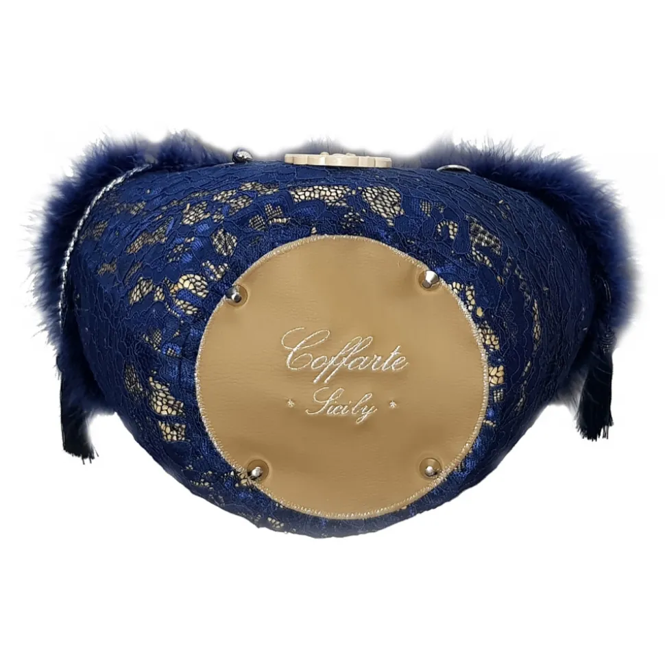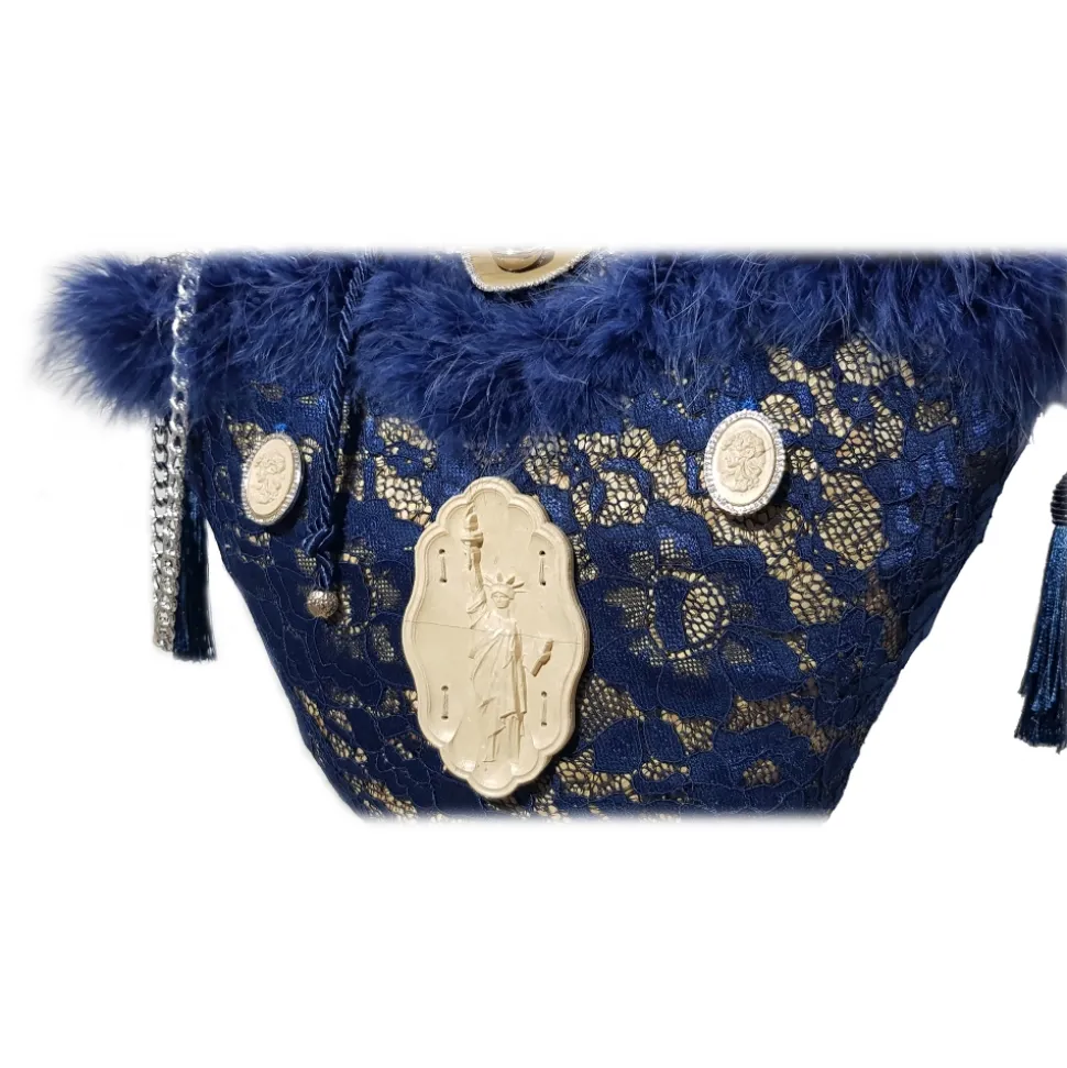 Upholstery in blue lace, trimmings with blue feathers, inside in fine fabric with bag closure; bell closure and eco-leather handles; central stone insert with the image of the statue of liberty, adorned on the sides with as many stone inserts with the image of cameos with edges enriched with rhinestones; tassels hanging on the sides, stone brand with the word “COFFARTE” and removable chain shoulder strap.