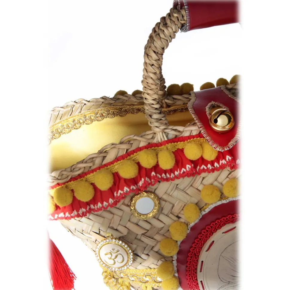Coffa dwarf palm woven by hand with a cheerleader trimmings decorations and onion; internal and yellow satin, oval central insert in stone with Muslim figure engraved cnc, lateral pendants with symbol OM. Closing bell and coffarte logo back stone.