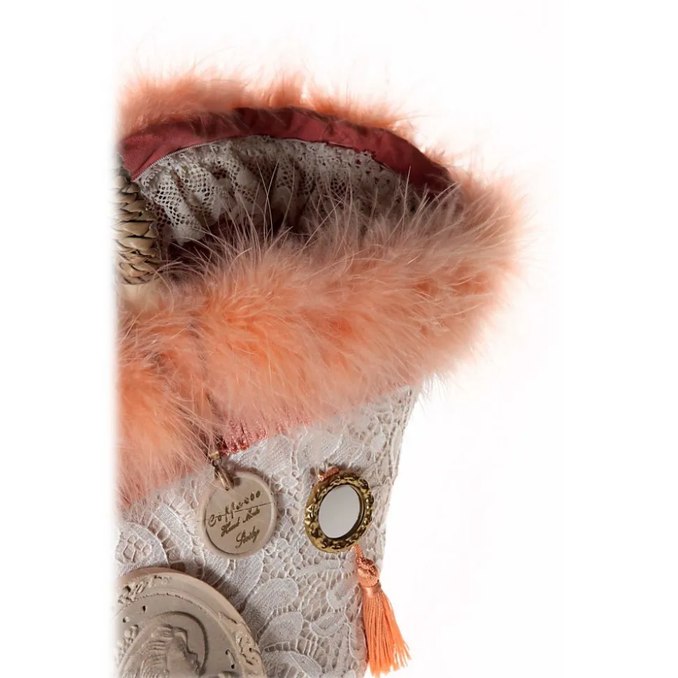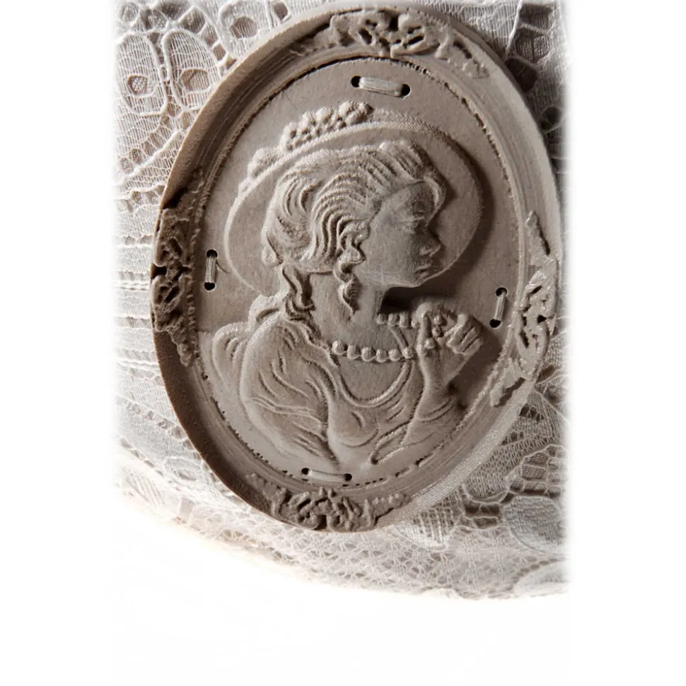 Covering in beige lace with fringe and faux fur on the upper edge of old rose, No. 2 inserts cameo engraved on stone. Woman back line elegant vintage.