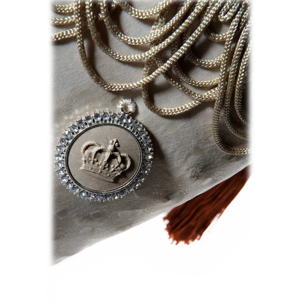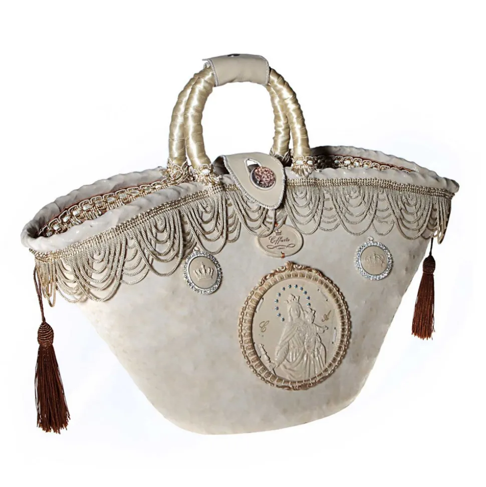 Coating fine stretch fabric, leather effect and sequins; fringe fall of rings, insert Baroque frame with Santa Maria Regina engraved on stone of Comiso, handles with satin ribbon and pearl button closure, elegant.