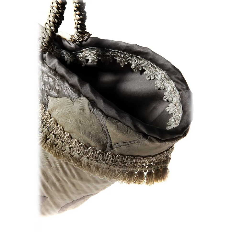 In patterned fabric, brocade with central insert in stone, depicting the jellyfish; button closure and finishes valuable trimmings and fringes, coffarte brand, rear stone hand-stitched.
