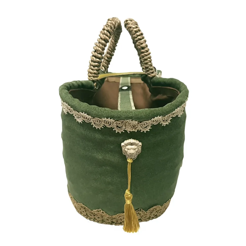 Upholstery in fine velvety fabric, with trimmings decorated with weaves; stone inserts on the sides depicting the Head of Lions with attached hanging tassels; bell lock, pocket for valuables sewn into the internal lining; central stone insert with dark brown image and circular zircon decorations. The Coffa Moro Sicily represents a traditional classic style and is adaptable at any time of the day.