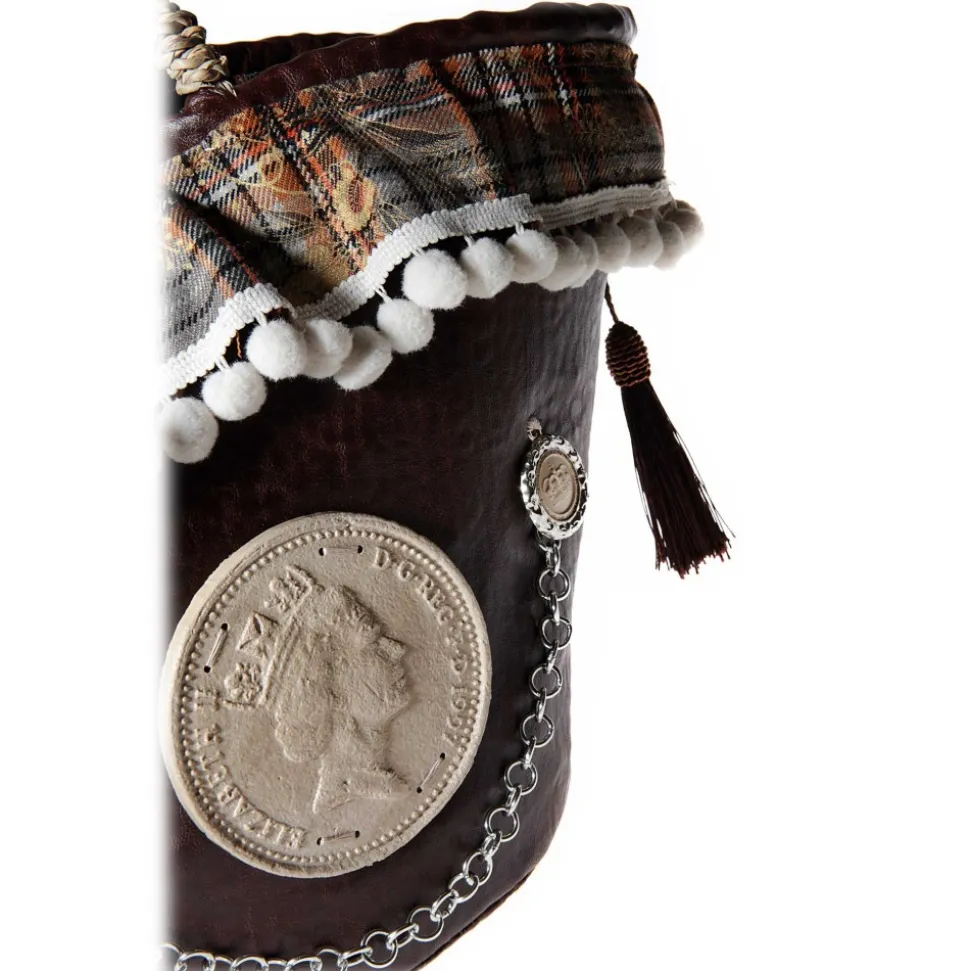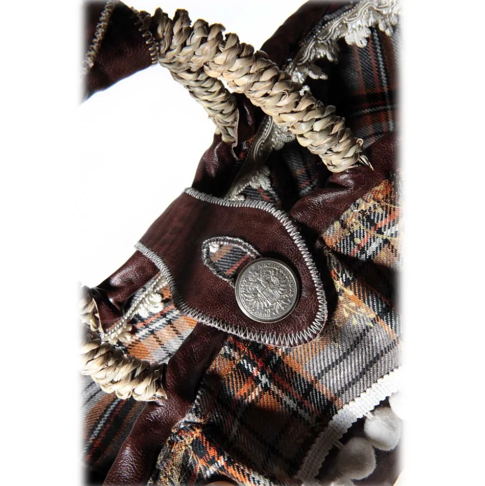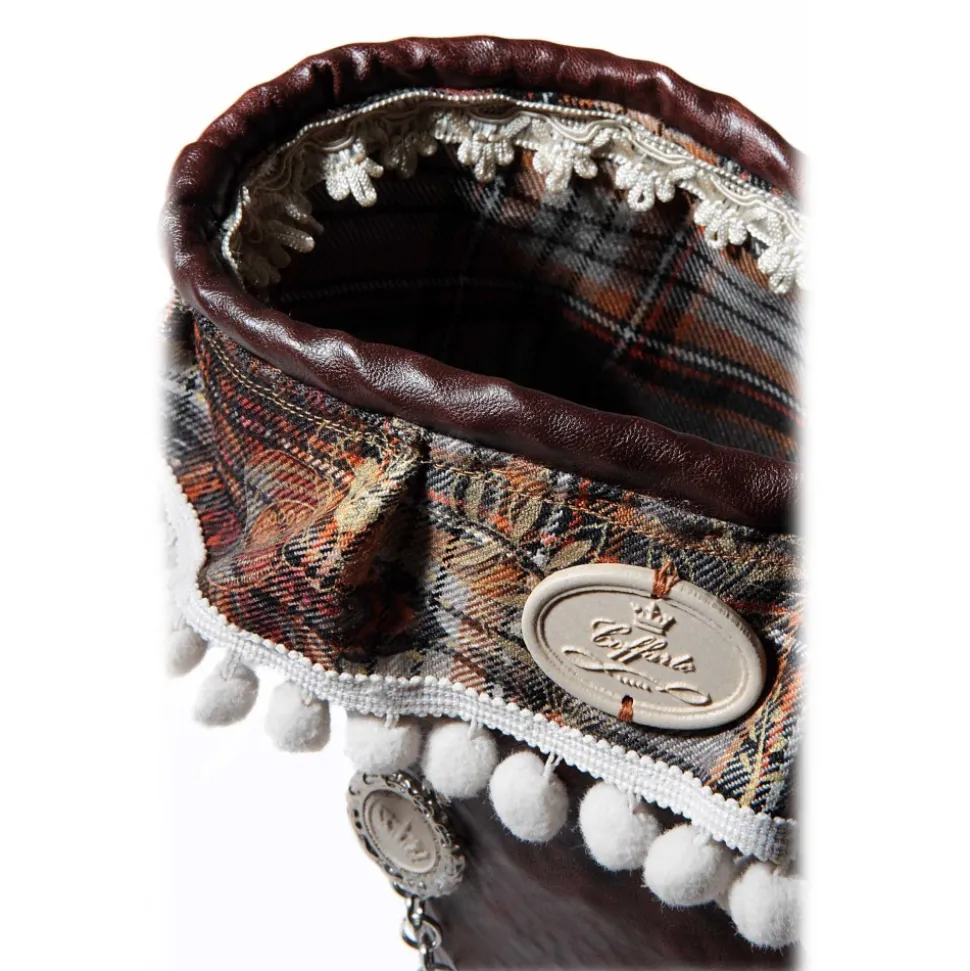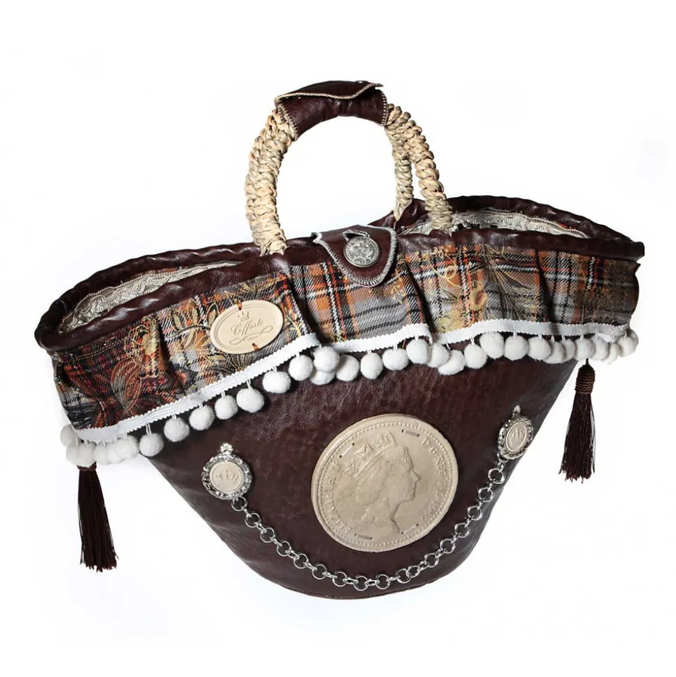 Coffa Queen Media in brown faux leather fringe and crumpled on handmade edge tartan pleated and trimmed with pompoms; closure prized button and central insert of Queen Elizabeth, oval logo in stone and with relief pendants of two crowns, leather bottom with coffarte logo and supporting feet.