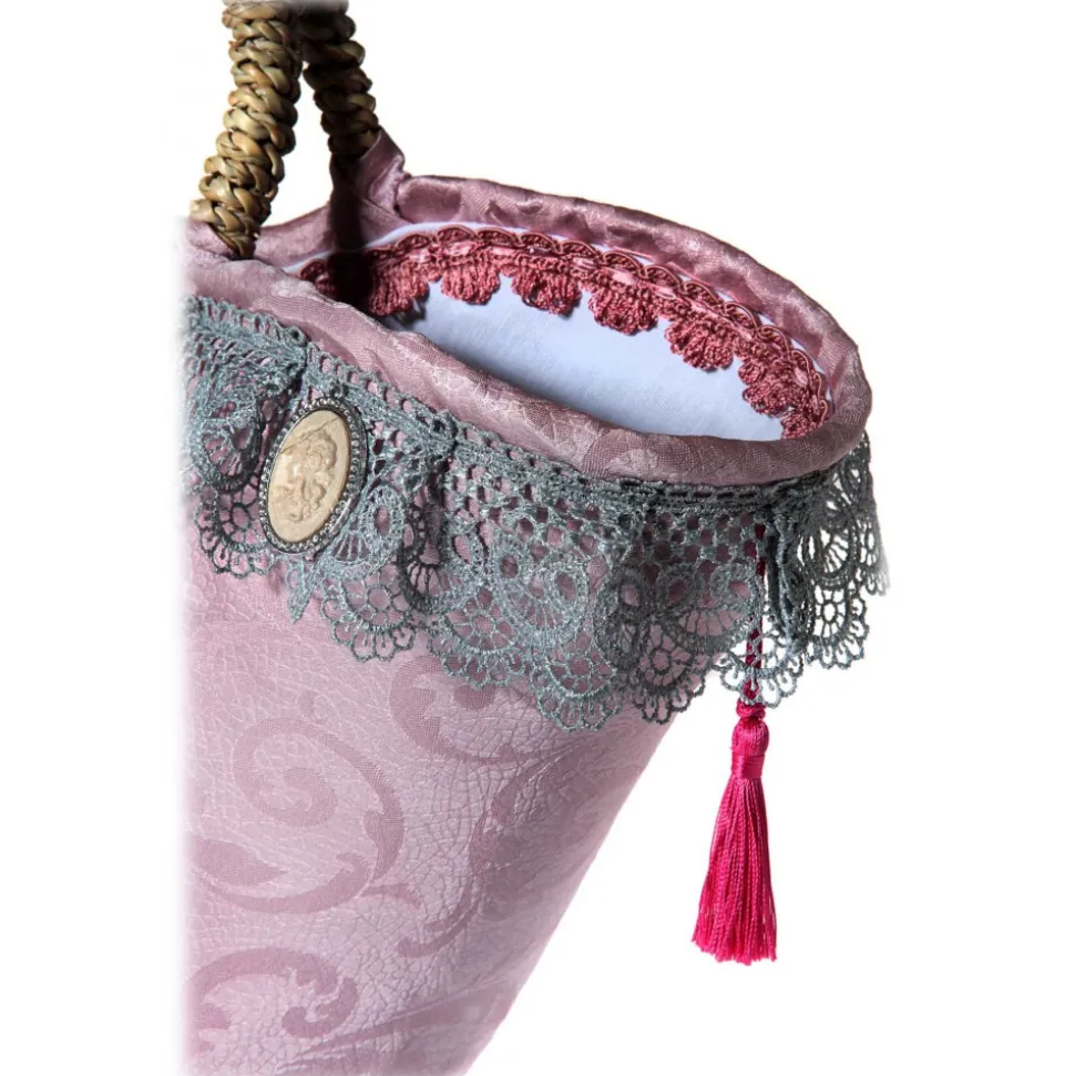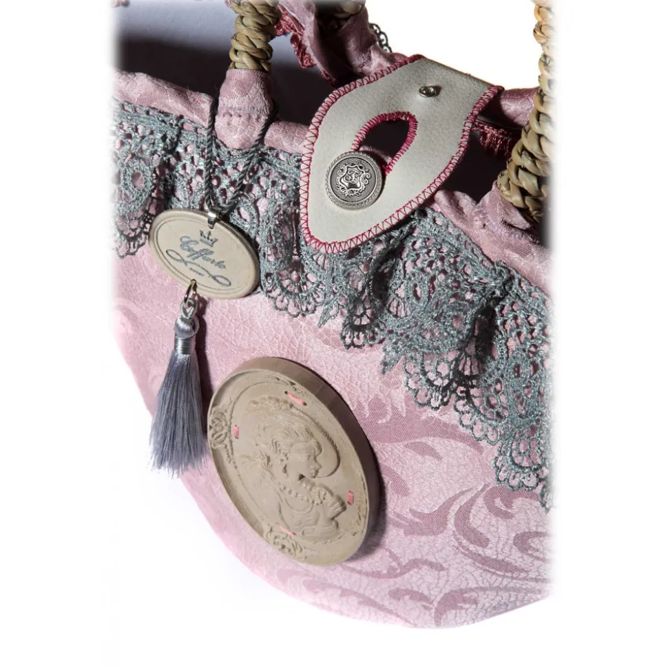 The vintage style coffa, covered with pink baroque patterned fabric from which the name derives (rosette); handcrafted where in the center a stone cameo is sewn with a classic frame depicting a nineteenth-century vintage woman and with precious pendants engraved on stone at the upper edge; fringed lace and tassels specially hand-sewn and Sicilian mirror engraved on stone adorn the coffia as well as the coffarte logo, button closure and inside pocket for valuables.