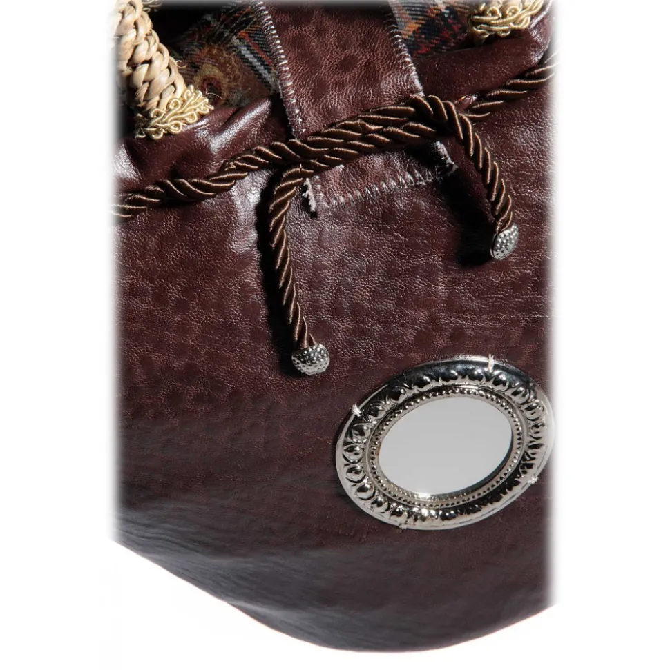 Coating faux brown leather brown side tassels with central insert, trinacria engraved on stone of Comiso and No. 2 side pendants with stone decorations; button closure and internal plaid fabric.