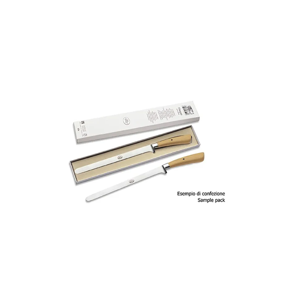 Exclusive set Coltellerie Berti 1895. Knives for meat, vegetables and cheeses, boxwood, forged blade. Full handle, cream.