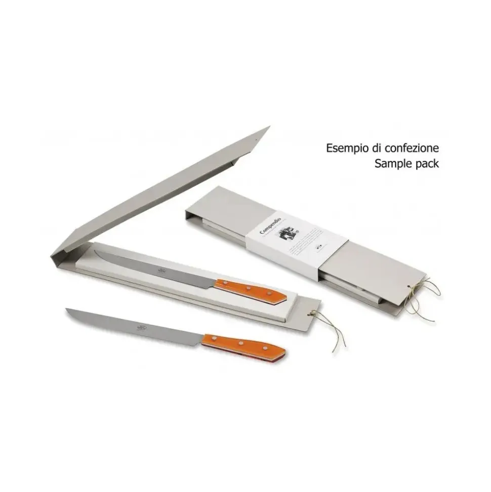 Exclusive Berti 1895 cutlery set. Raw and cooked meat knives, plexiglass, laser cut blade. Whole tang, orange.