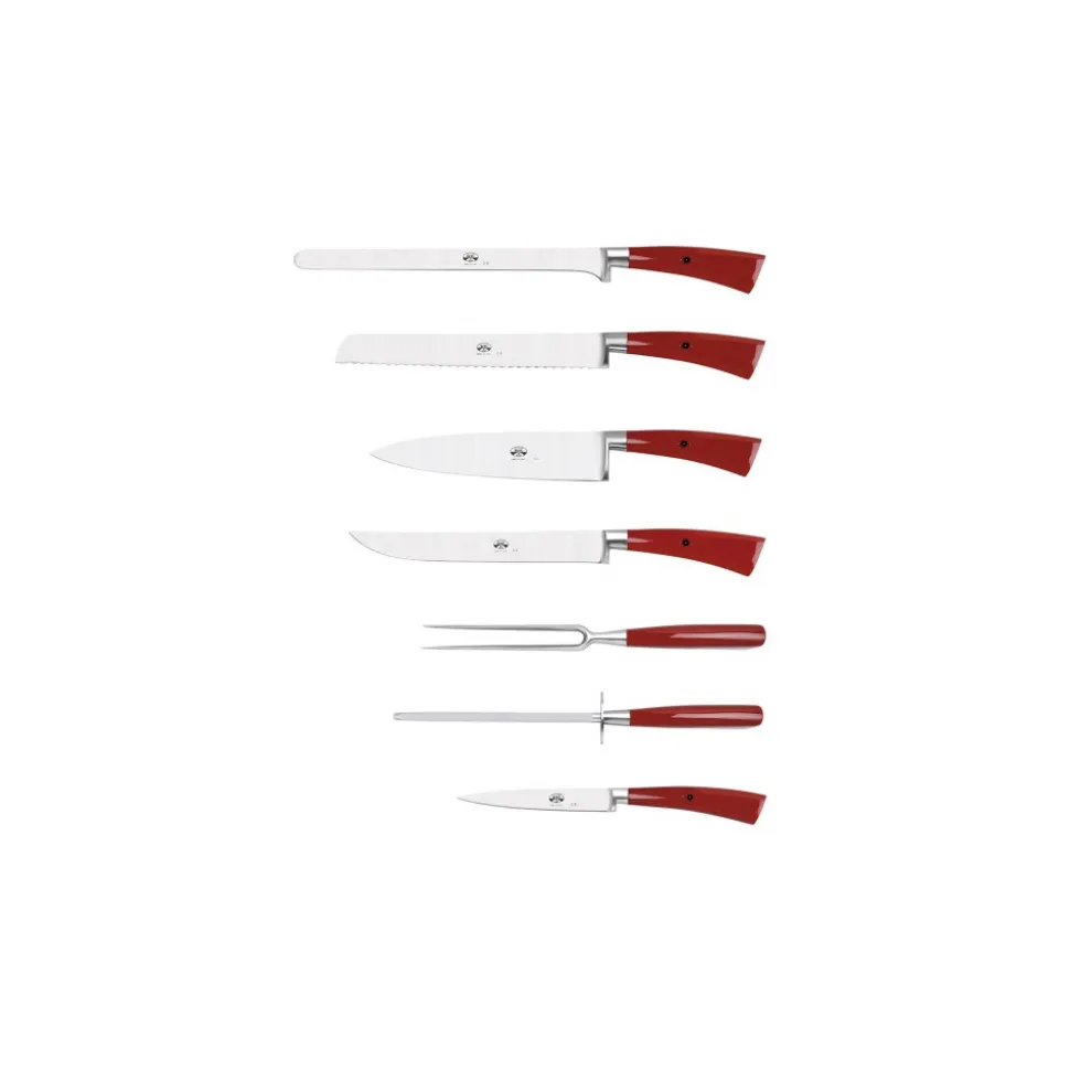 Exclusive Berti 1895 Cutlery Set. Preparation and service set, plexiglass, forged blade. Full handle, red.