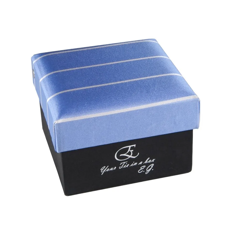 Simplicity and elegance are the key elements of this single stripe tie that will allow for multiple color parings.In its luxury box you can find two cuff-links and a pocket square, all of the same motif of the tie. Not forgetting the polished steel clip for the final touch. Based on an original idea, the motif and tie box are labeled under the brand E.G. that is represented on the box with an elegant signature discreetly located on the side of the box.