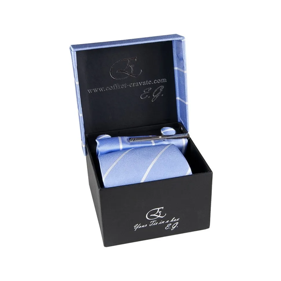 The box includes a silk tie of sky blue color, coordinated cuff-links, pocket square and a polished steel tie clip.