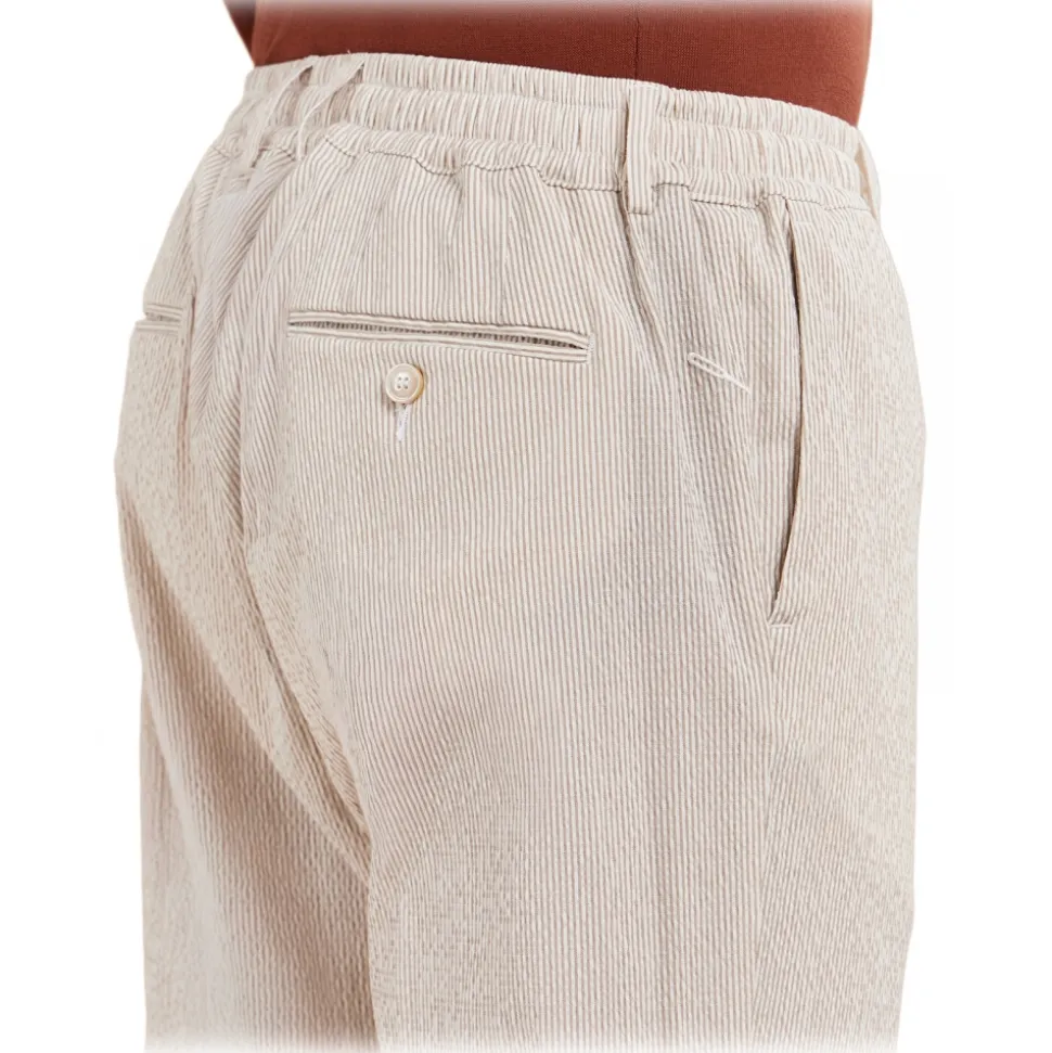 Tapered fit trousers with elasticated belt in stretch pinstriped seersucker