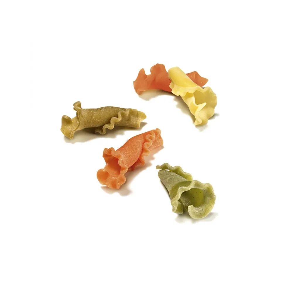 Italian specialties colored and flavored. Italian pasta is enjoyed first with eyes, then with the palate and you disclose it when durum wheat of high-quality meets dehydrated vegetables and spices of Mediterranean flavors. The selection of Italian tricolor pasta is flavored with tomato, oregano and basil sun-ripened and other vegetables that characterize the final taste of the dish with originality and humor. This tricolor pasta is bronze drawn and produced by combining the duration of time with low temperature, in the drying step, which preserves all the organoleptic characteristics, while ensuring a perfect consistency and an excellent cooking resistance. The chromatic emotion in the plate of pasta tricolor is evoked by the colors that refer to Italy, a country where this flavored pasta tells one of the oldest culinary traditions.