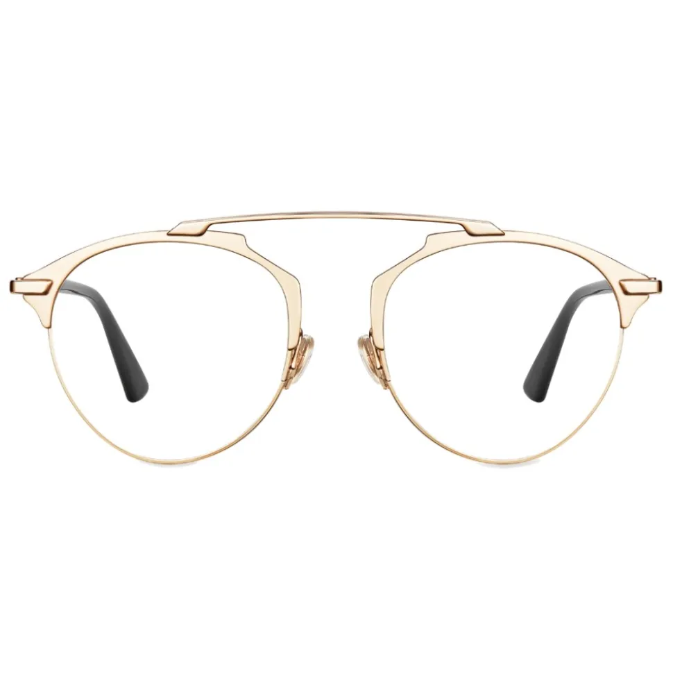 The DiorSoRealO glasses revisit the shape of the iconic DiorSoReal model in a vision version. Flat and ultra-thin, the golden metal emphasizes the exclusive architectural design of the model. The thin temples are in black acetate and golden metal.