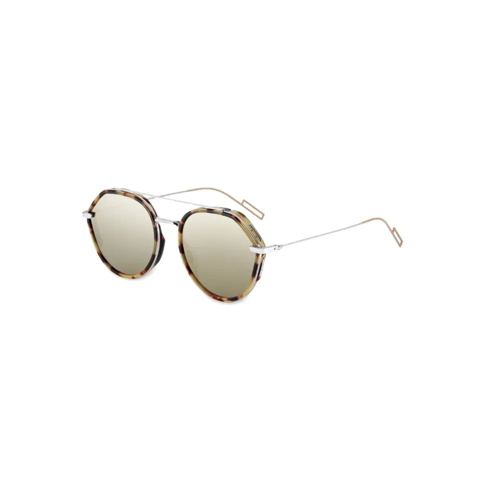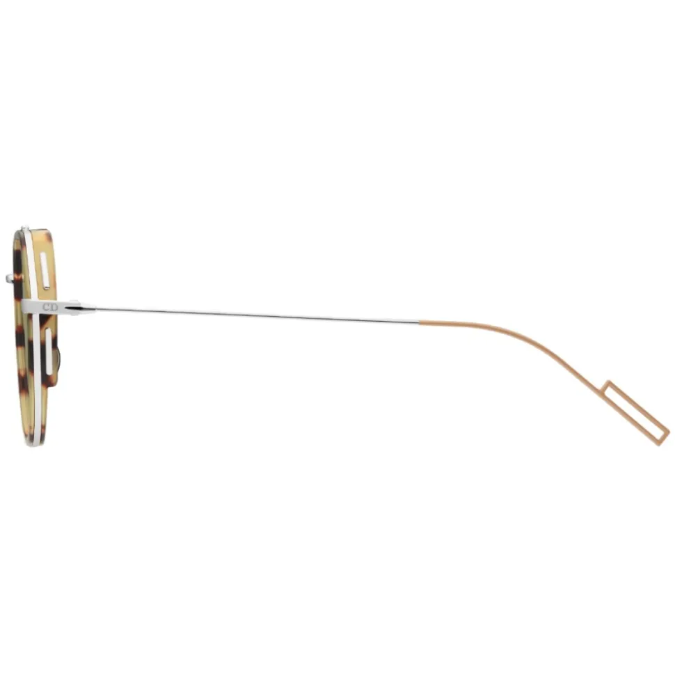 “Dior0219S” sunglasses with rounded shape. The front in turtle acetate is embellished with a double bridge in silver metal. The acetate spoilers are underlined by graphical metal details. The opaque beige lacquered ultra-thin perforated temples give a glimpse of the emblematic scar of Dior Homme.