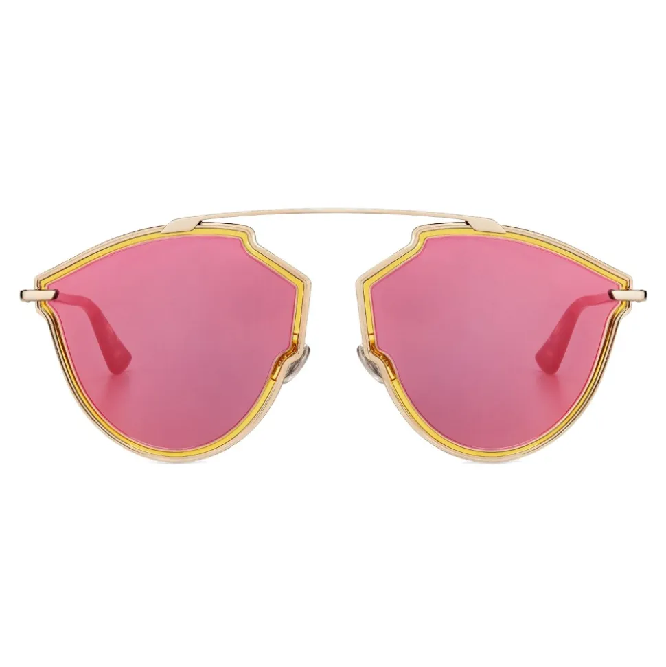 The DiorSoRealRise sunglasses reinterpret the iconic DiorSoReal shape in a lightweight oversized technical version. Fuchsia lenses are highlighted by a transparent yellow acetate frame inserted in the golden ultrathin metal of the frame.