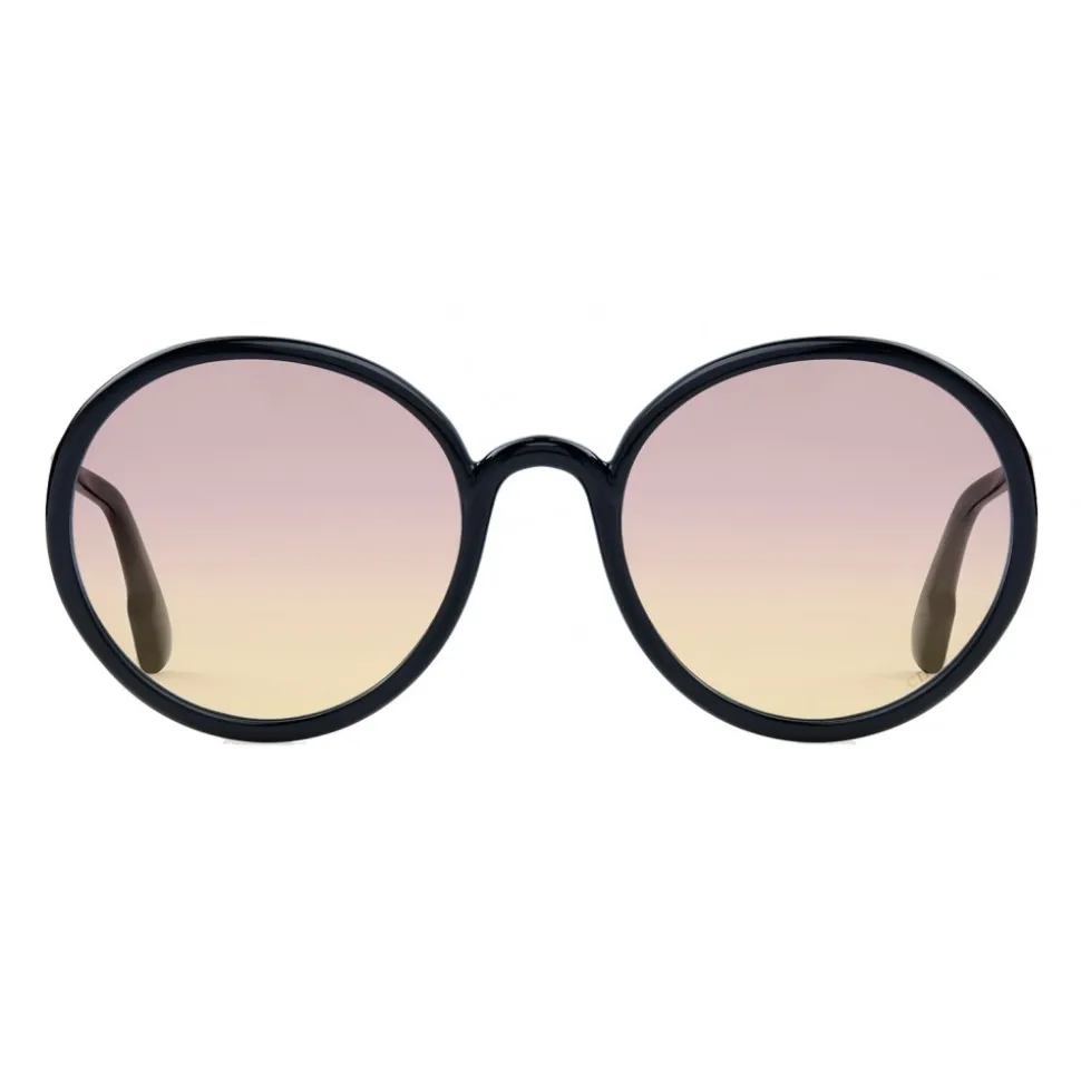 The DiorSoStellaire2 sunglasses are characterized by a small round shape. The frame entirely in black acetate highlights the shaded effect of lenses ranging from pink to yellow.