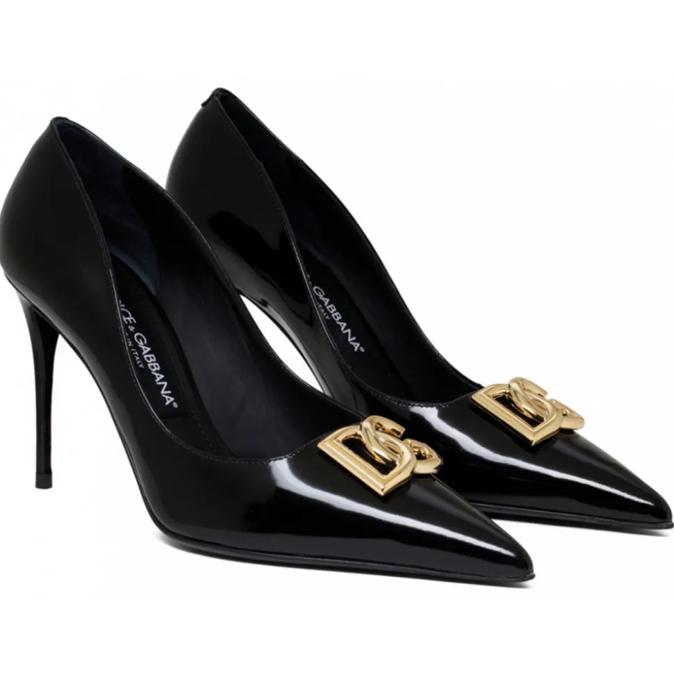 Dolce & Gabbana Black Lollo Pumps. Black polished calfskin pump with DG logo cut out. Kidskin insole with branded label, branded leather sole, 90 mm heel.
