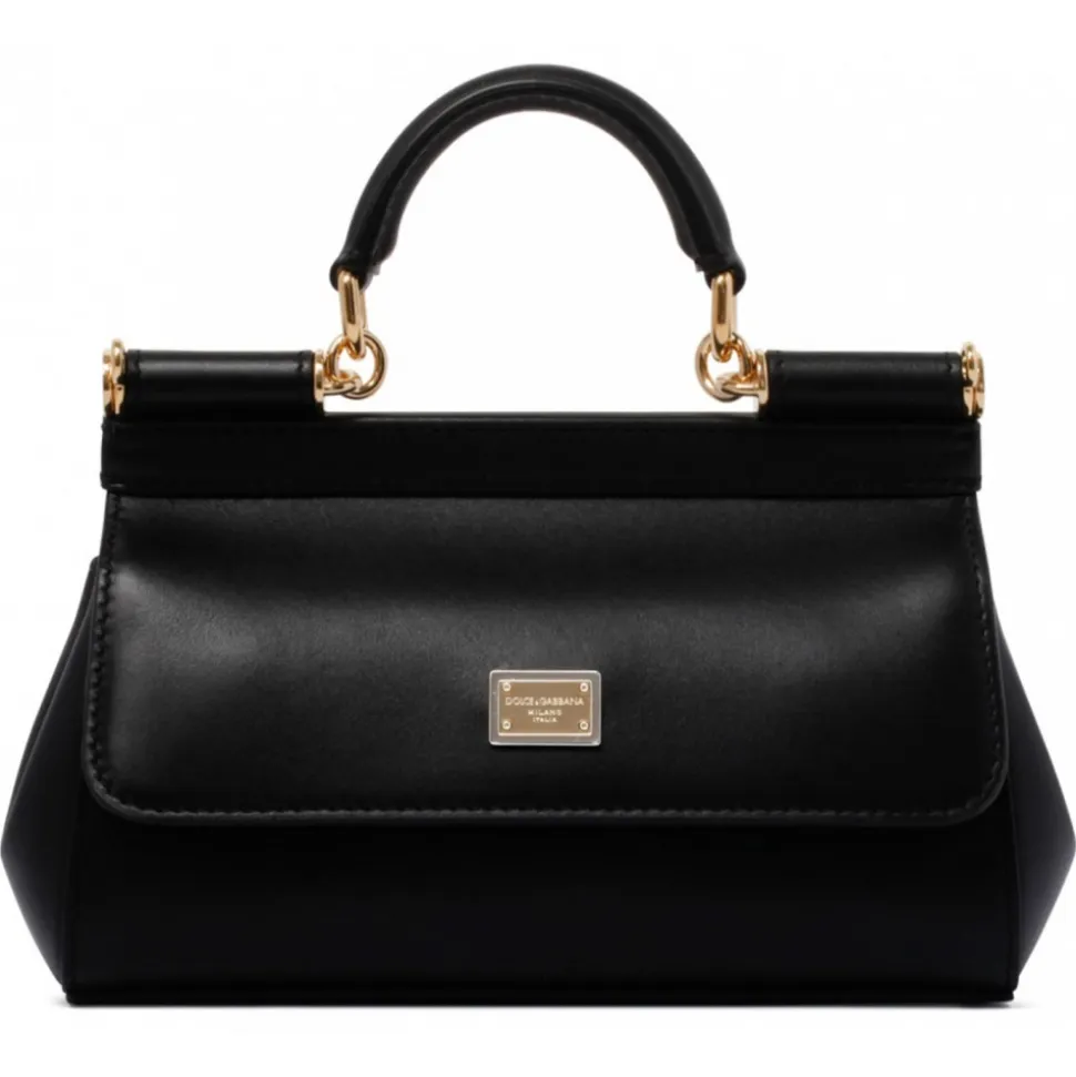 Dolce & Gabbana Black Sicily Small Handbag. Black mall Sicily bag in calfskin, front flap with hidden double magnet closure. Bigalvanic logo tag, top handle and adjustable and removable calfskin shoulder strap. Printed fabric lining and flat pocket