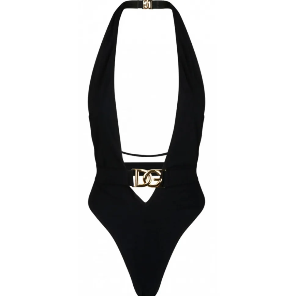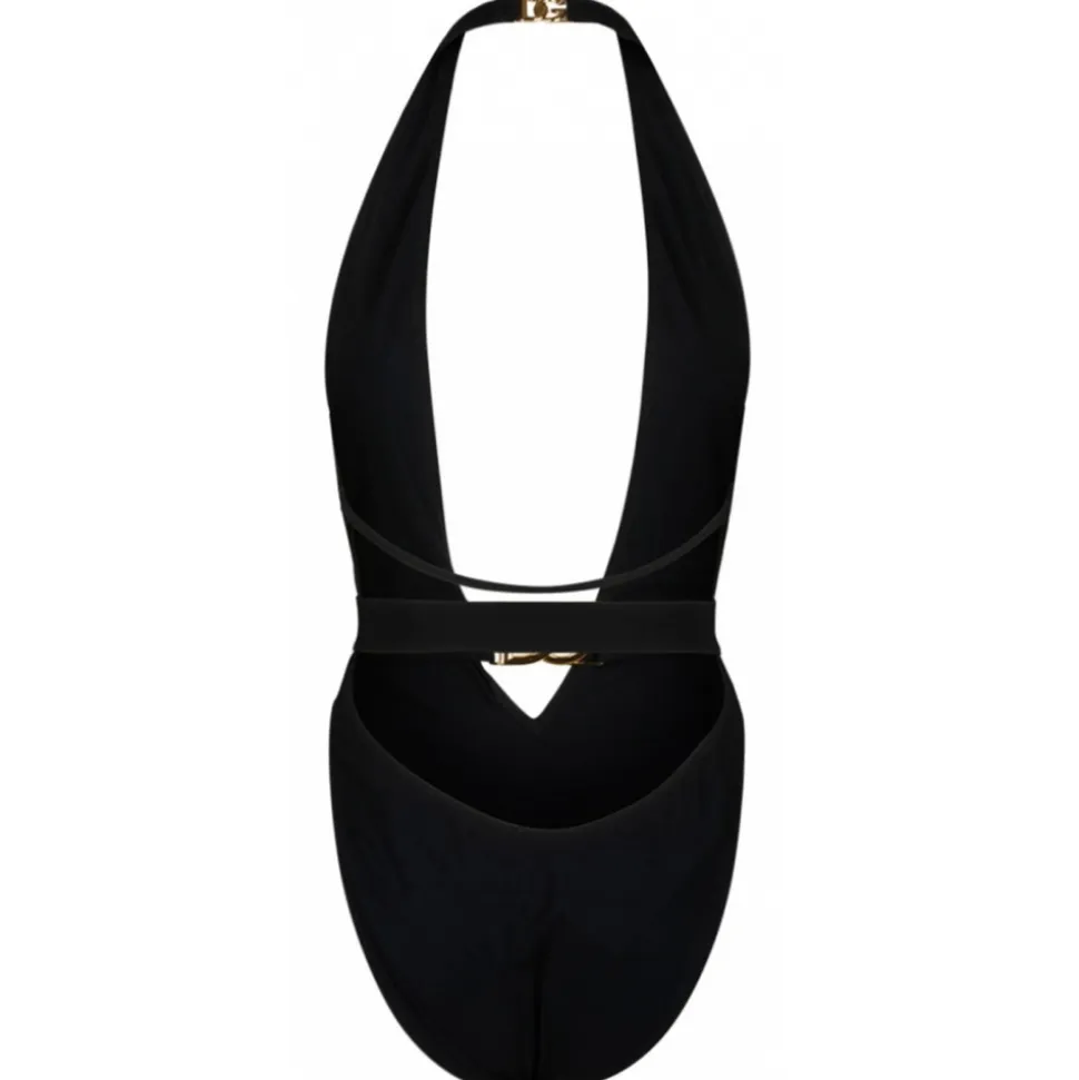 Dolce & Gabbana Black Swimwear With Gold Logo Plaque. Deep v-neckline and low back, halter neck lacing. Back buckle closure.