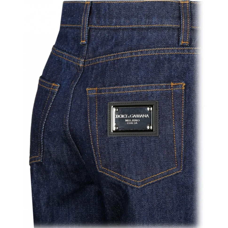 Dolce&Gabbana Blue Denim Flare Jeans. Blue cotton denim jeans, front button closure, classic five pockets design. Dolce&Gabbana plaque in the back pocket, flare design.