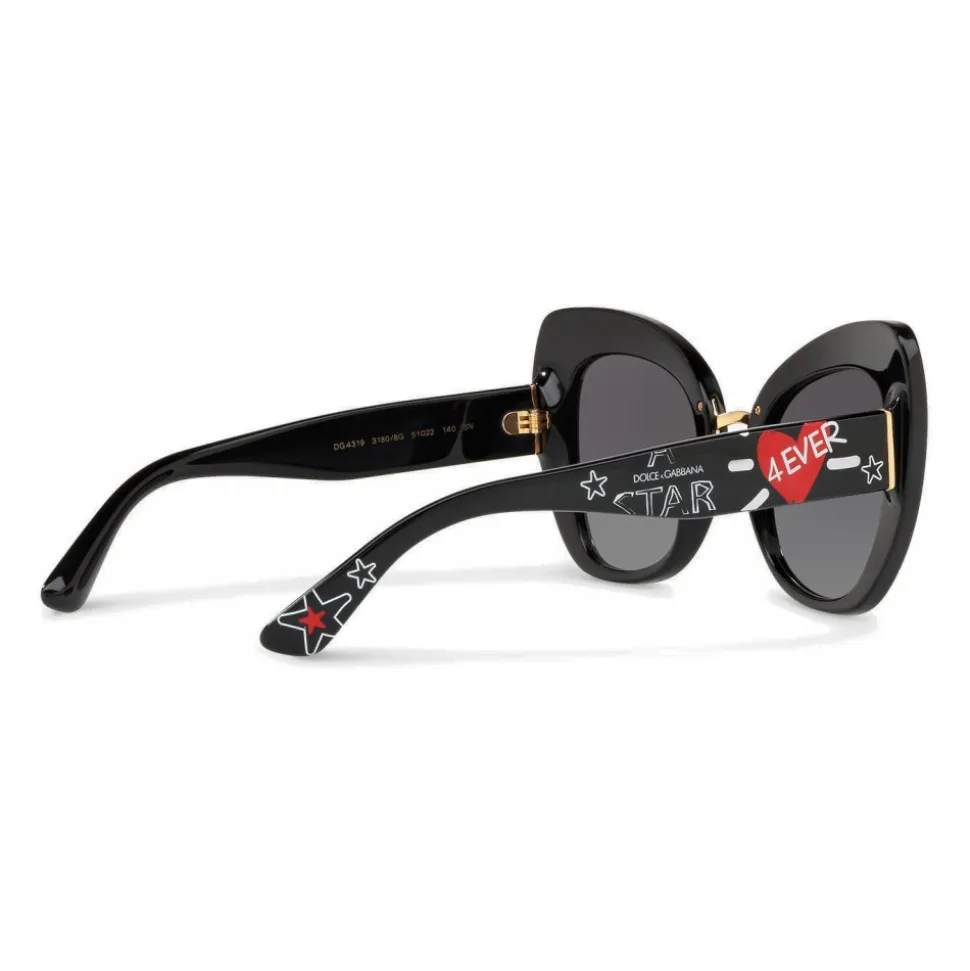 Butterfly shaped acetate sunglasses with a metal bridge characterized by graffiti printing. Auctions personalized with the Dolce & Gabbana logo.