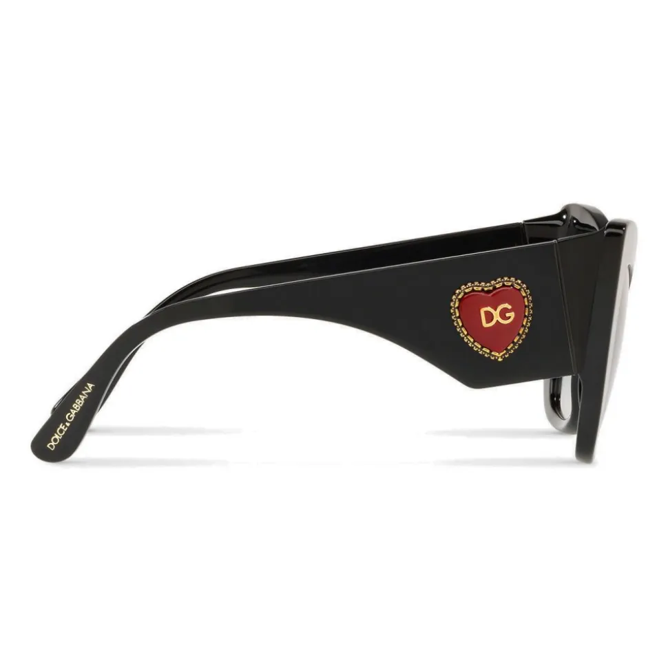 Cat-eye sunglasses in acetate. The sinuous temples are embellished with a relief decoration in the shape of “Sacred Heart” personalized by the monogram DG and garnished with a laced metal embroidery.