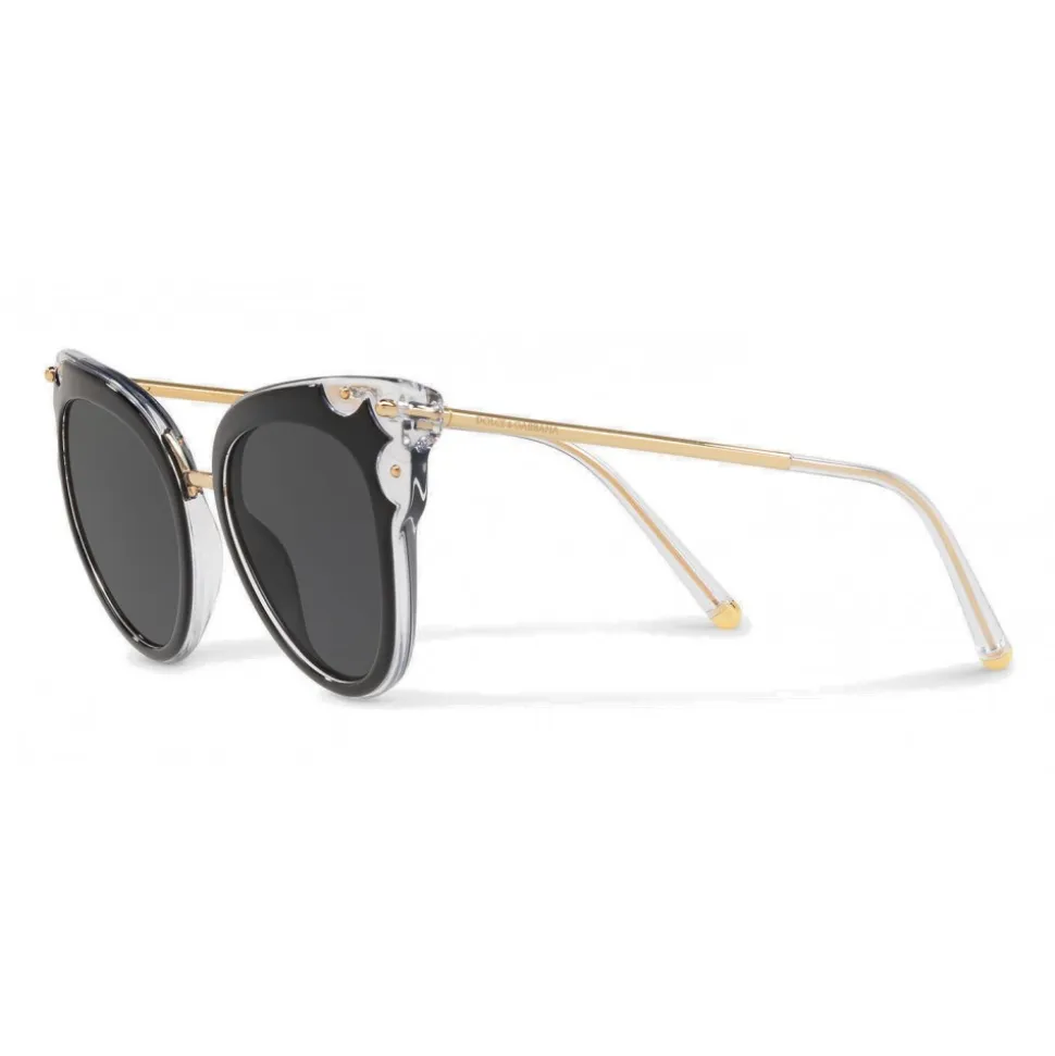 Cat-eye sunglasses in acetate embellished with metallic details and a metal bridge. Dolce & Gabbana logo finely engraved on metal temples.