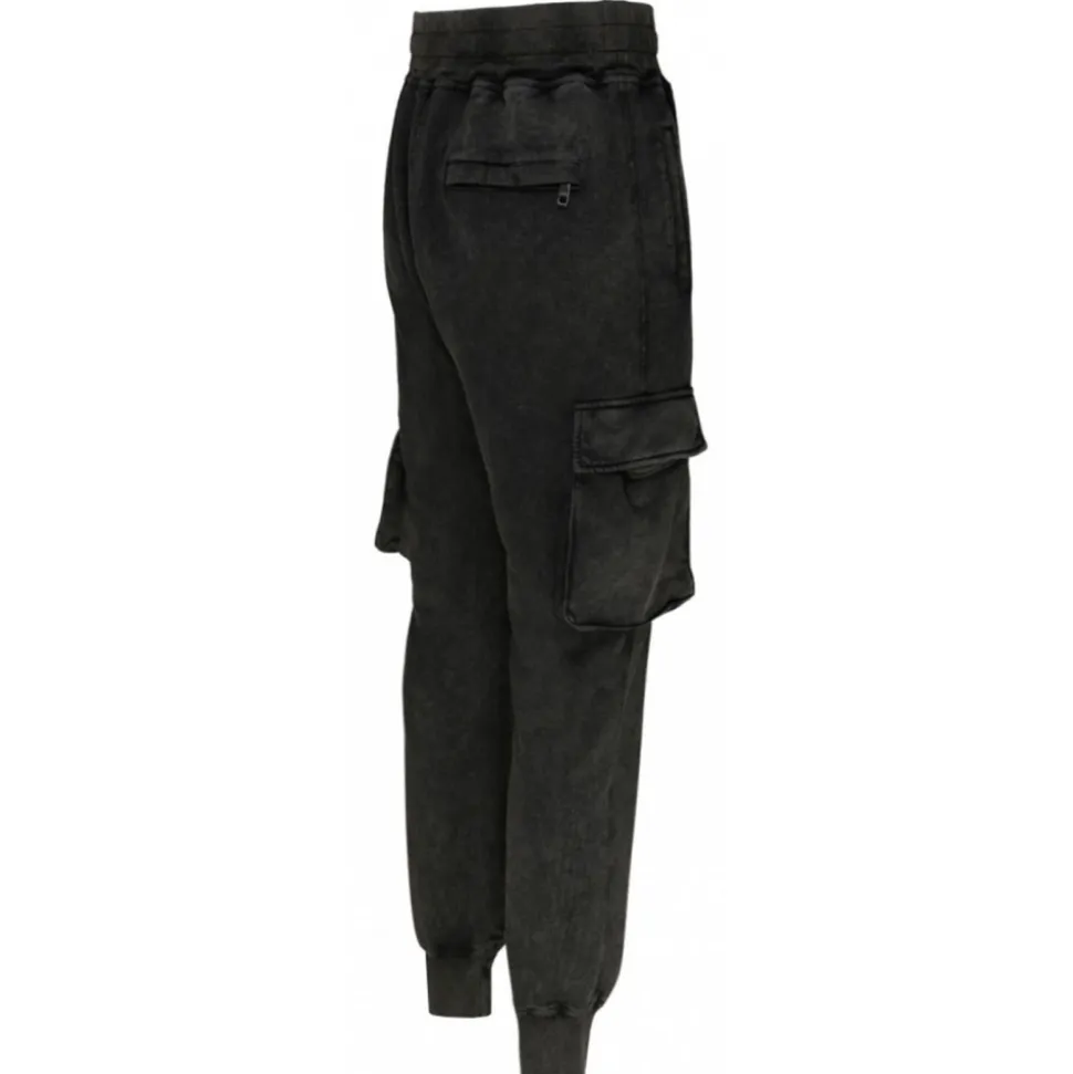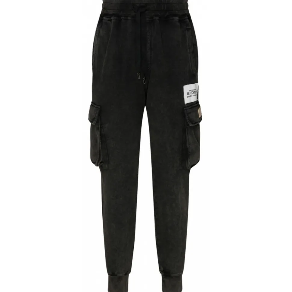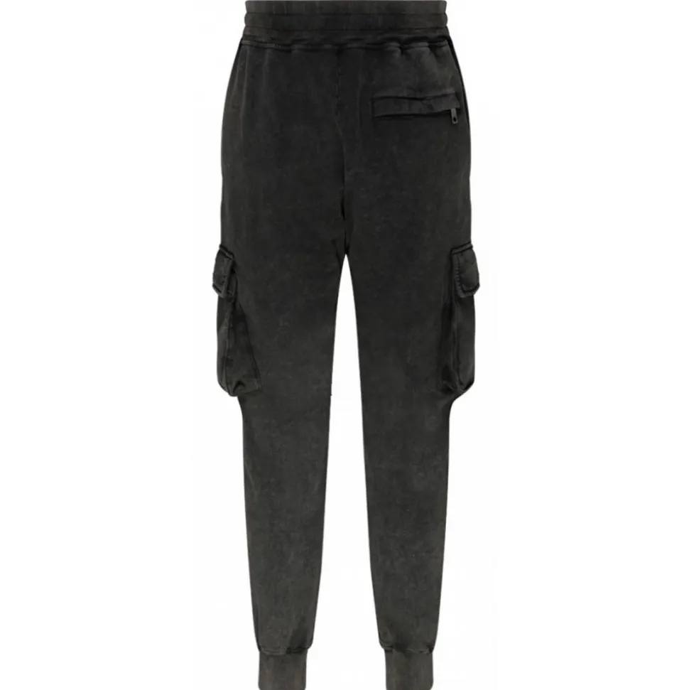 Dolce & Gabbana Dark Grey Tapered Cargo Trousers. Dark grey cotton cargo trousers, washed, logo patch to the front, gold tone logo plaque, elasticated drawstring waistband, two side slit pockets, two side cargo pockets, tapered leg, elasticated ankles.