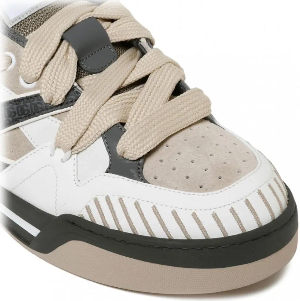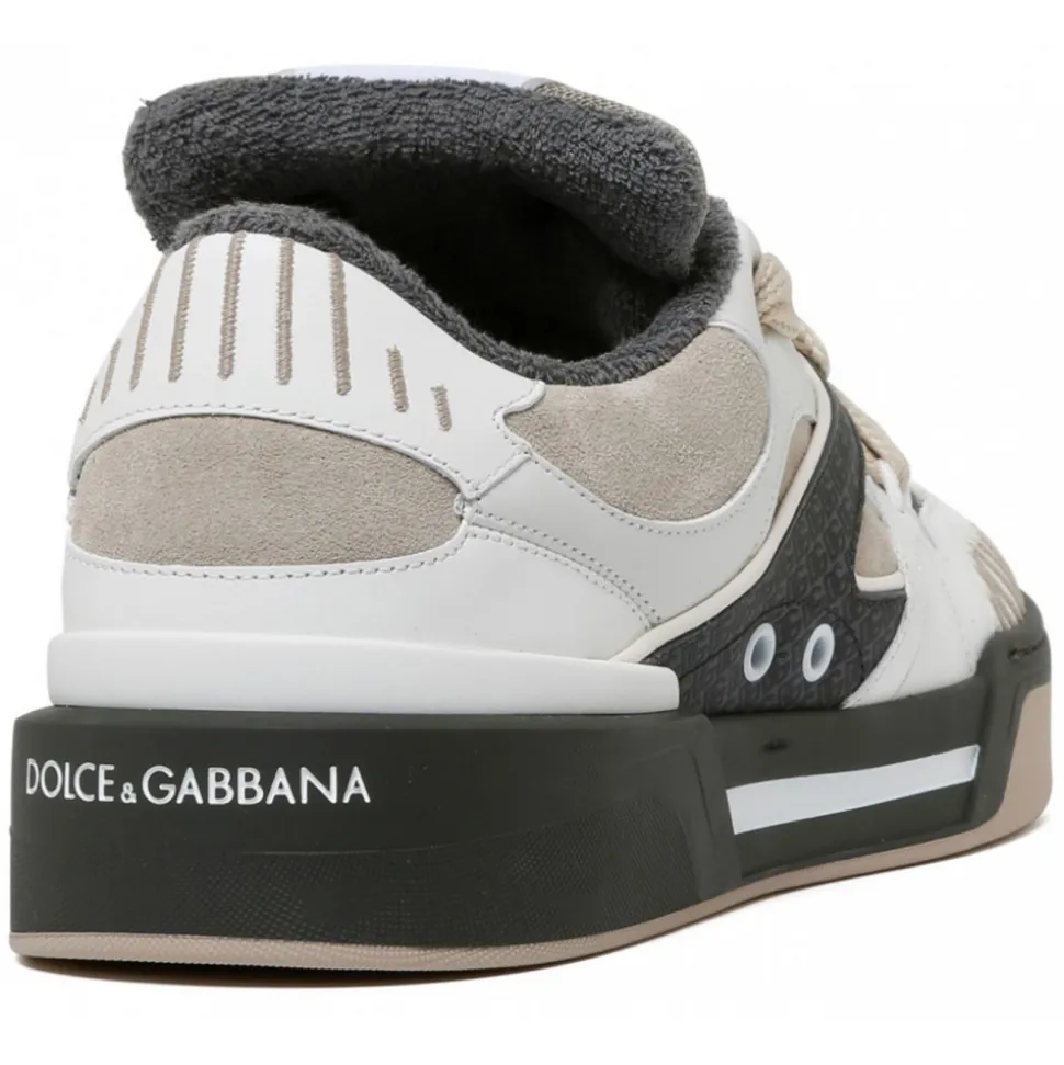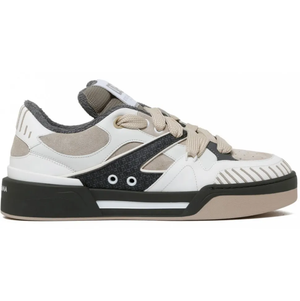 Dolce & Gabbana New Roma Sneakers. New Roma sneaker in calfskin and suede with logo insert, flat laces, logo tongue. Calfskin footbed with logo label and logo rubber sole and sole.
