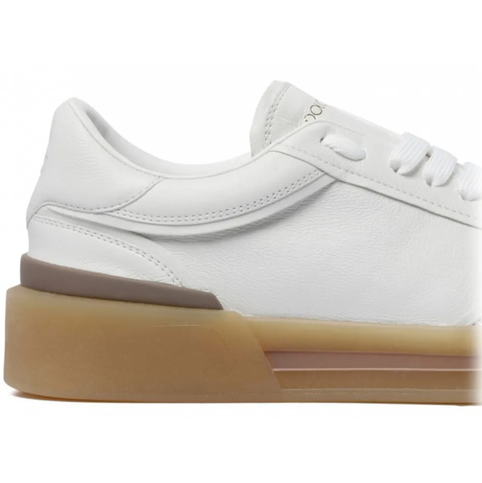 Dolce & Gabbana New Roma Sneakers. White leather sneakers, logo print tongue, round toe, perforated toebox. Front lace up fastening, branded leather insole, flat rubber sole.