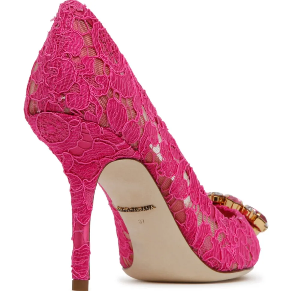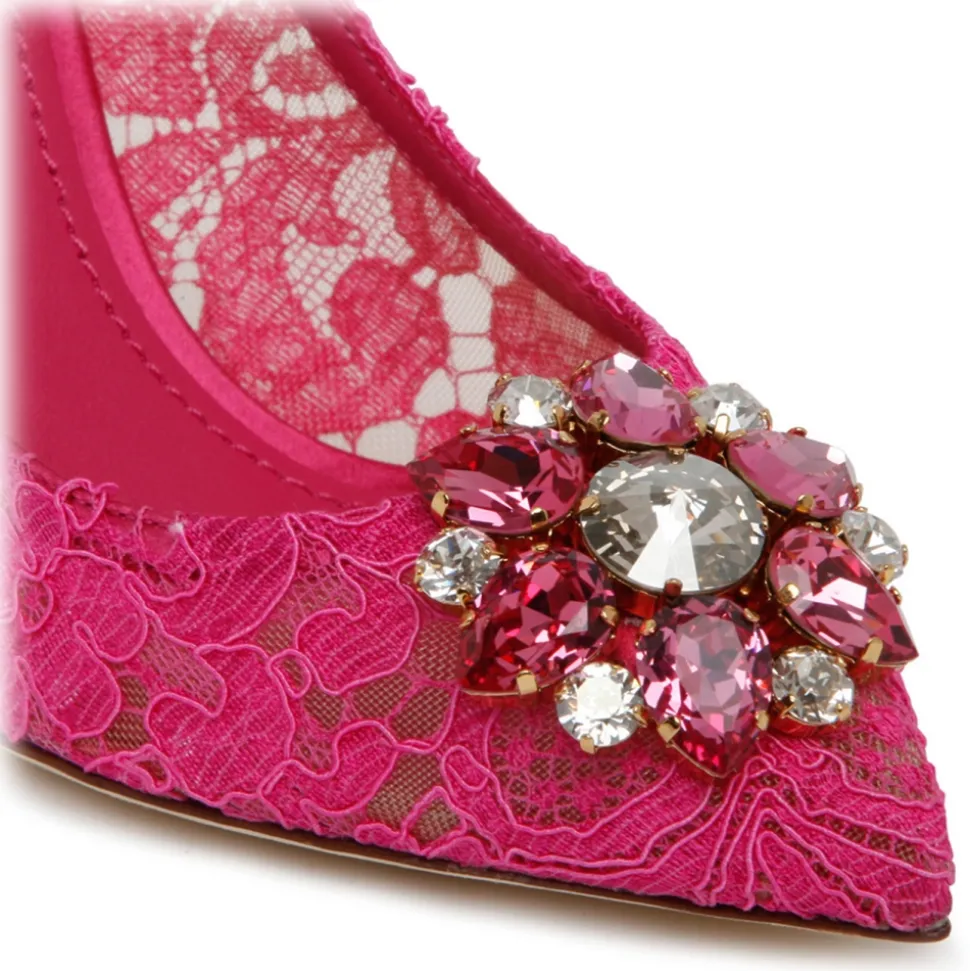 Dolce & Gabbana Pink Calf Leather Blend Bellucci Taormina Pumps. Pink calf leather blend pumps, lace detailing, buckle detail at the toe, pointed toe.