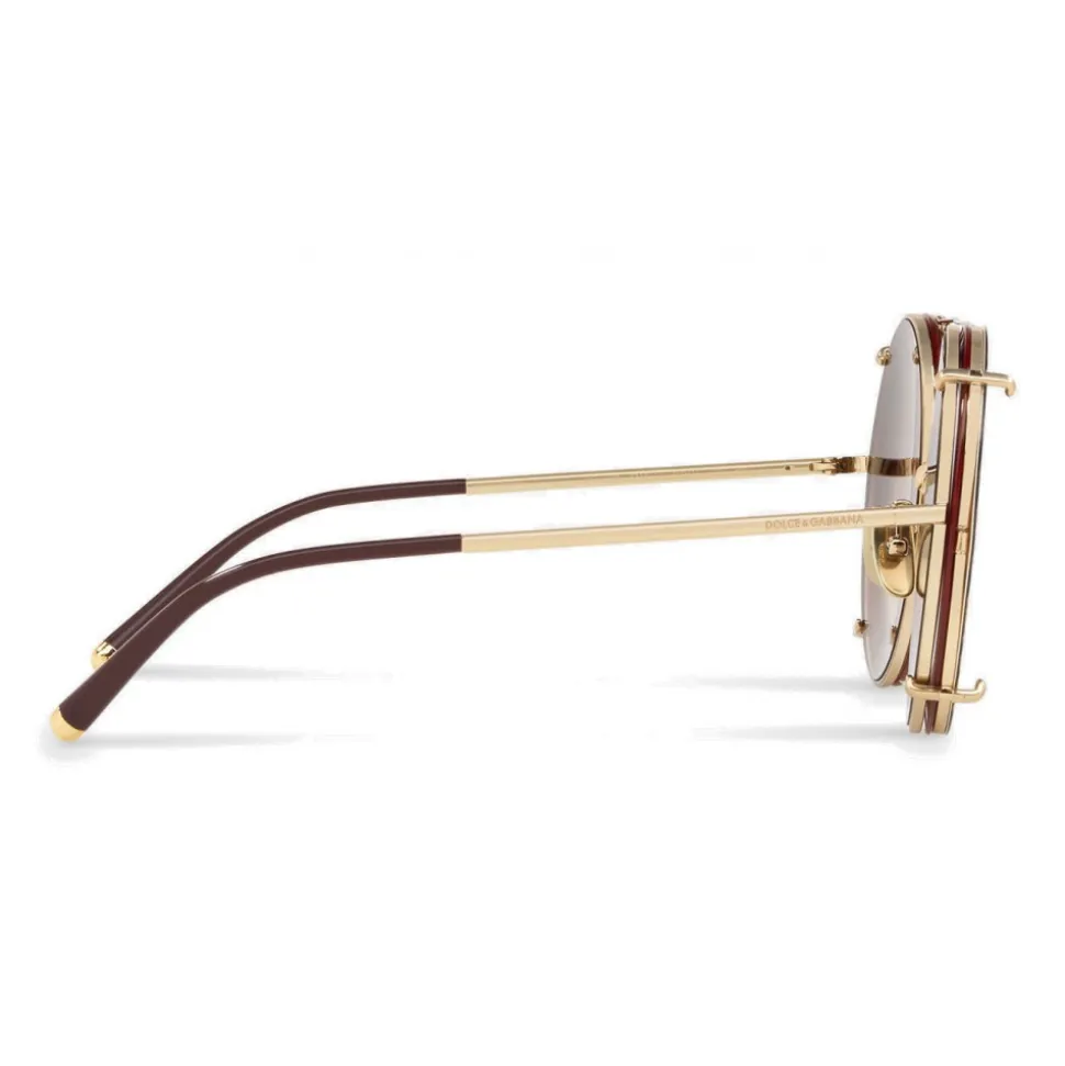 Personalization and versatility characterize the round sunglasses in golden metal with shaded lenses. An innovative project that allows you to wear three models with a single frame, changing the clip on characterized by the havana print and Sicilian majolica. The auctions are personalized with the Dolce & Gabbana logo. Comfort is guaranteed by flexible temples and adjustable nose pads.