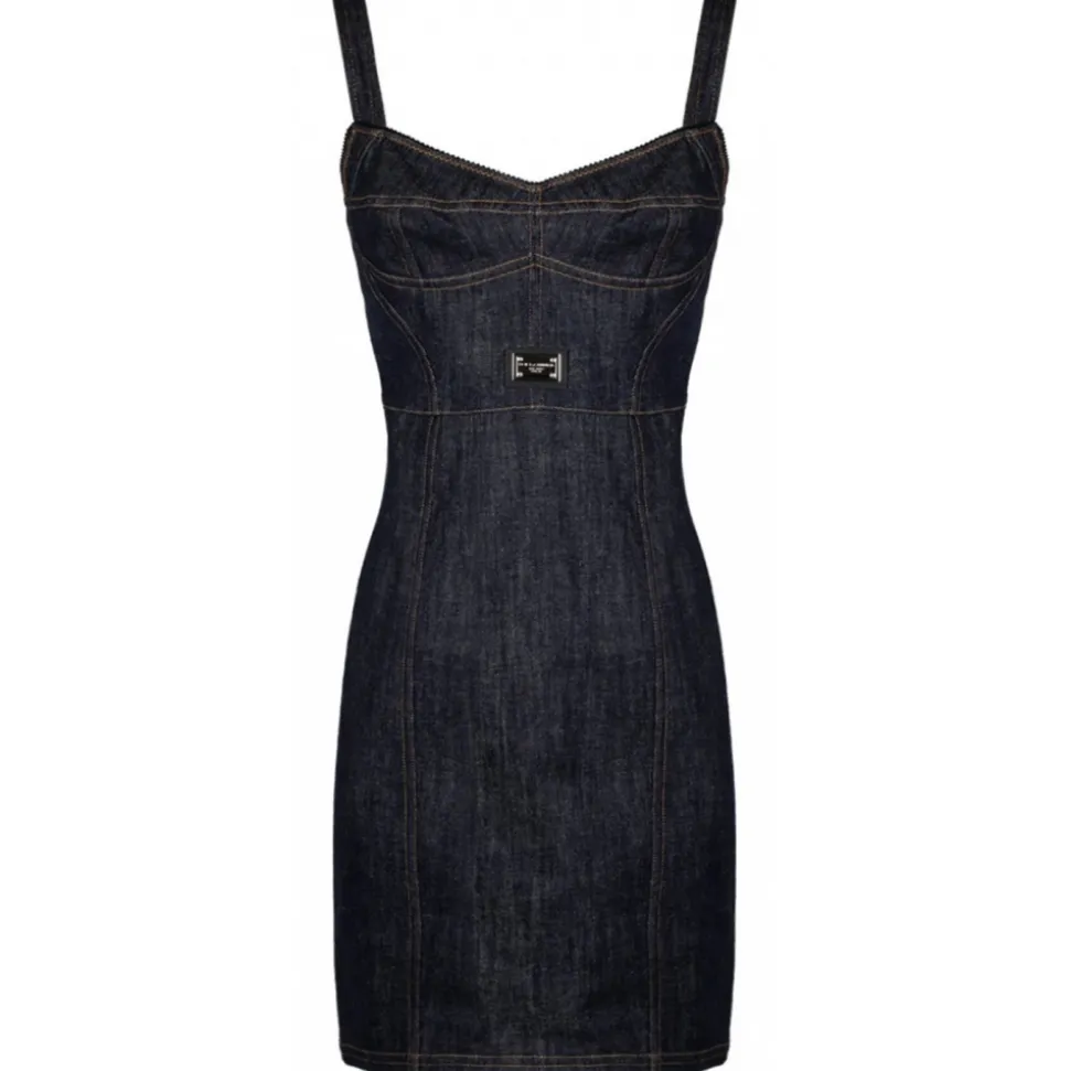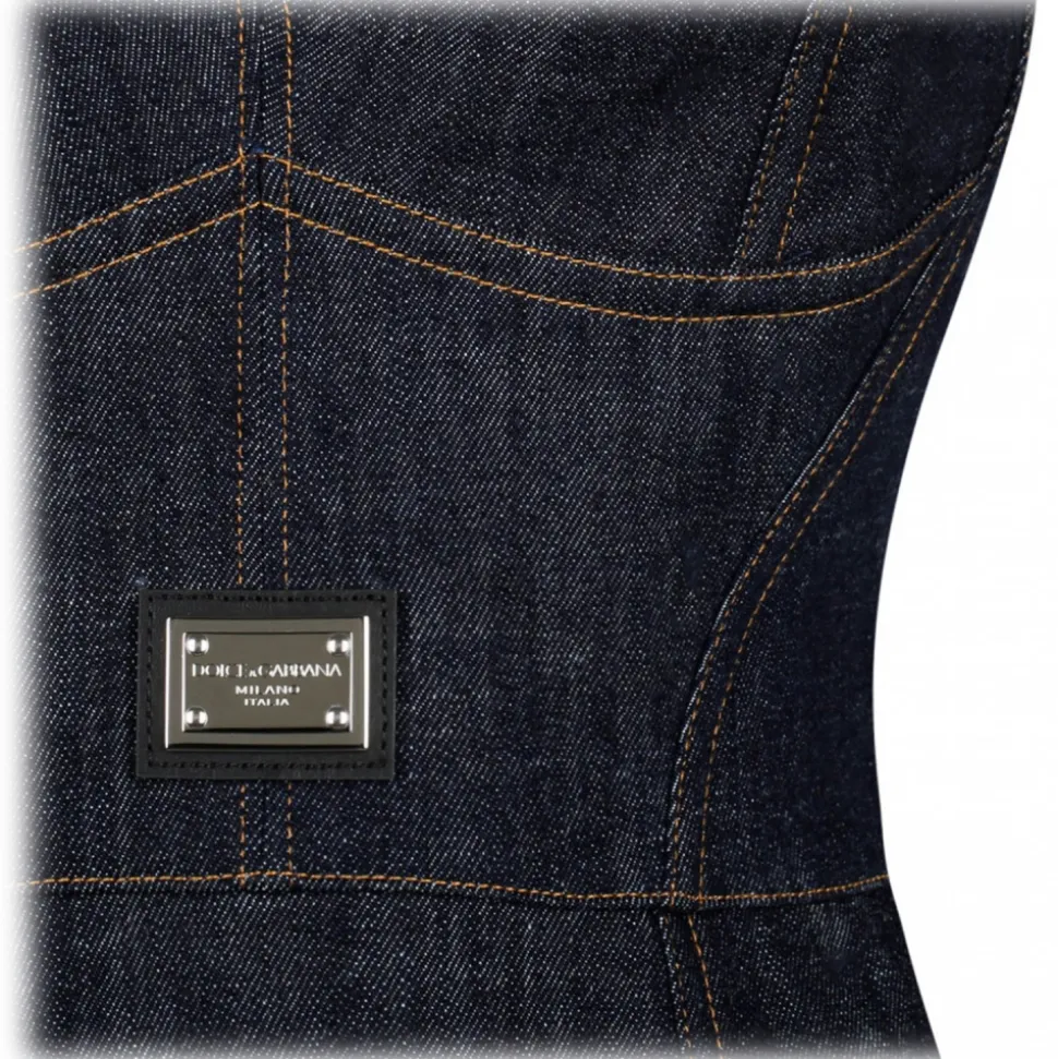 Dolce & Gabbana Stretch Design Denim Dress with logo plaque at waist, square uncovered scarf, bustier style neckline, back zipper closure. Sleeveless.