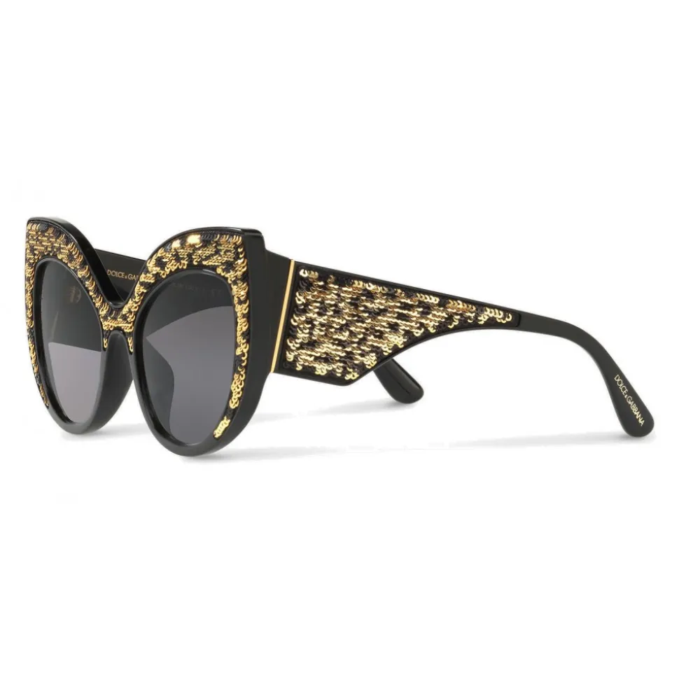 Acetate sunglasses with a cat-eye shape. The model is decorated with leo sequins and shaded black lenses.