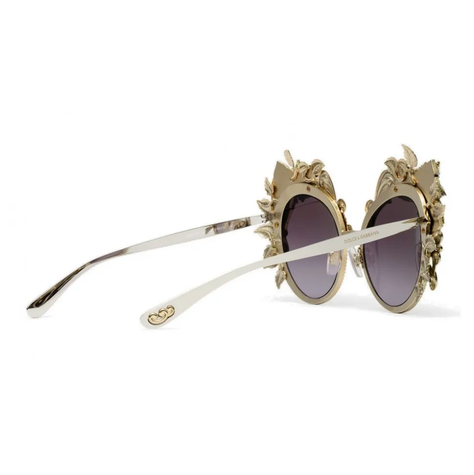 Sunglasses in metal with a round shape embellished with gold baroque swirls, flowers composed of small beads and handmade leaves. The temples, personalized with the Dolce & Gabbana logo, are embellished with gold color details.