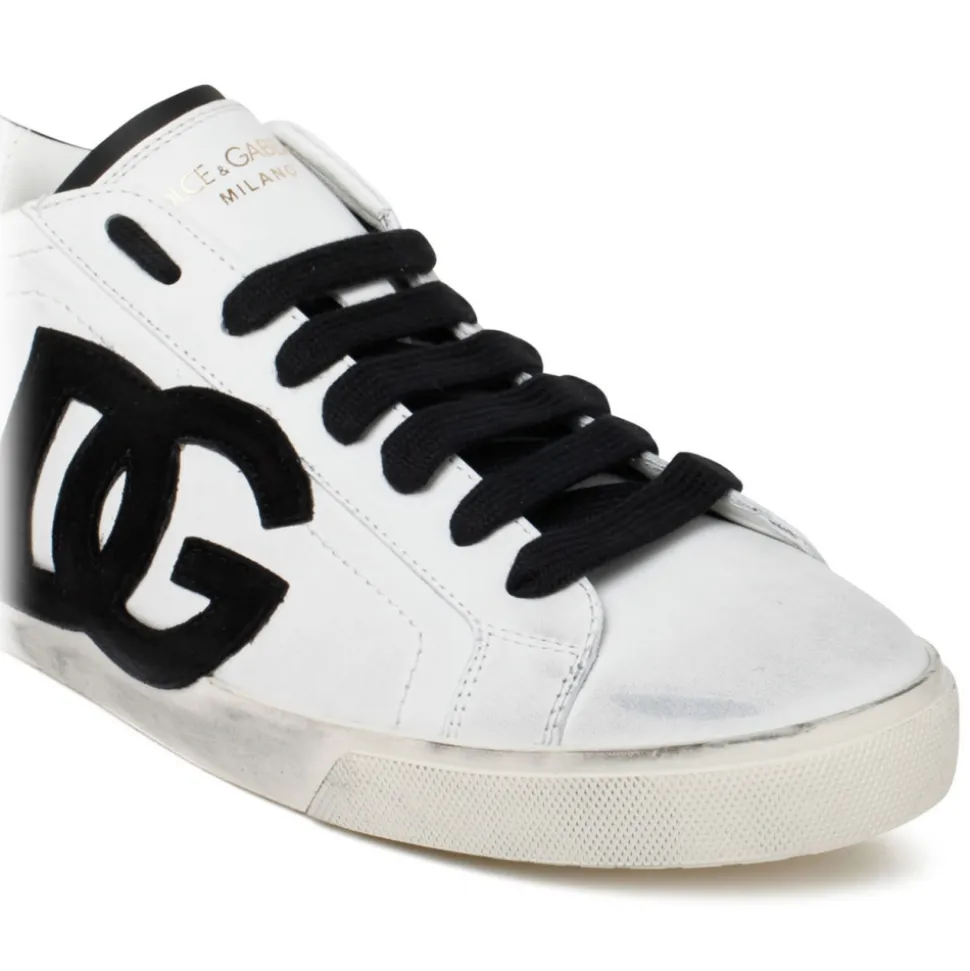 Dolce & Gabbana White and Black Calf Leather Portofino Low Top Sneakers. White and black calf leather sneakers, distressed effect, logo patch to the side, logo embossed tongue, rubberised logo detail, front lace up fastening round toe, branded insole, flat rubber sole.
