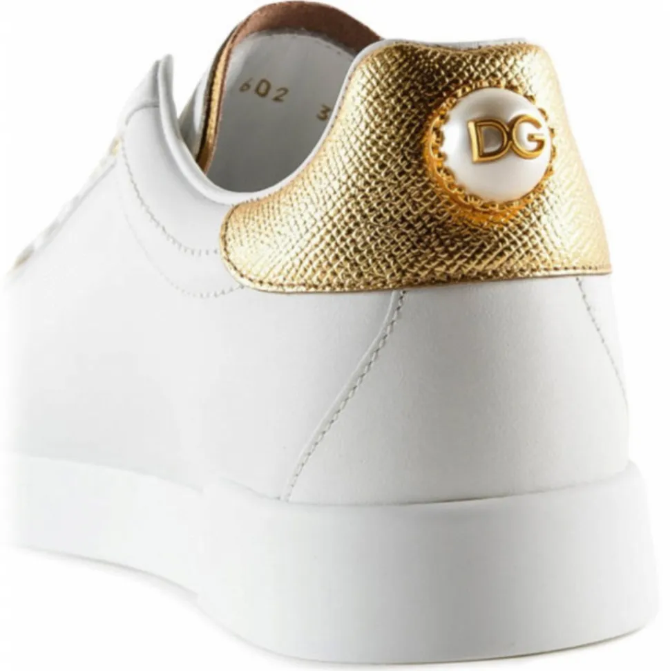 Dolce & Gabbana White and Gold Portofino Sneakers. White and gold low top sneakers, calfskin upper with contrasting heel cup and branded pearl detailing, branded label, flat laces, calfskin footbed with branded label, branded rubber sole.