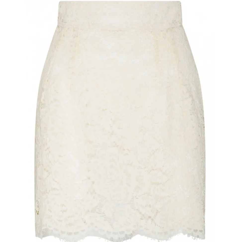 Dolce & Gabbana White Silk Blend Floral Lace Miniskirt. White silk blend miniskirt, floral lace detailing, thigh length, high waist and scallop hem.