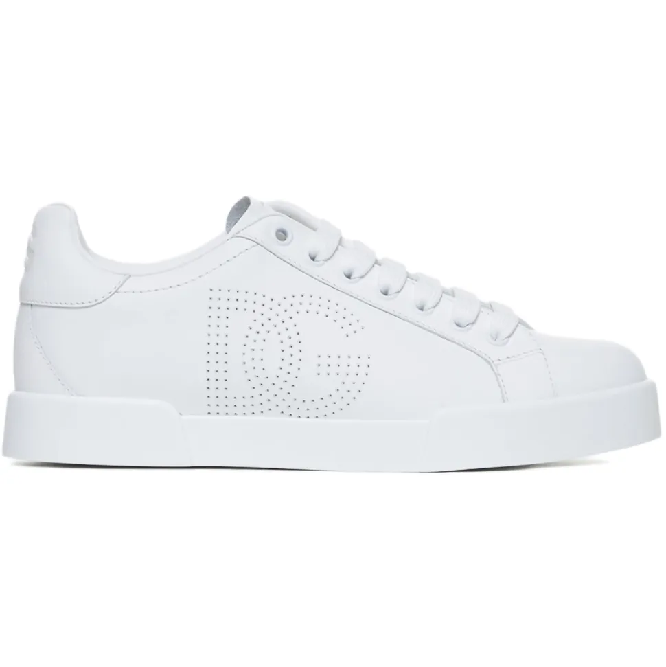 Dolce & Gabbana White Portofino Sneakers. White calf leather sneakers, round toe, side perforated logo detail. Logo print tongue, branded heel counter, padded ankle, branded leather insole. Flat rubber sole, front lace up fastening.