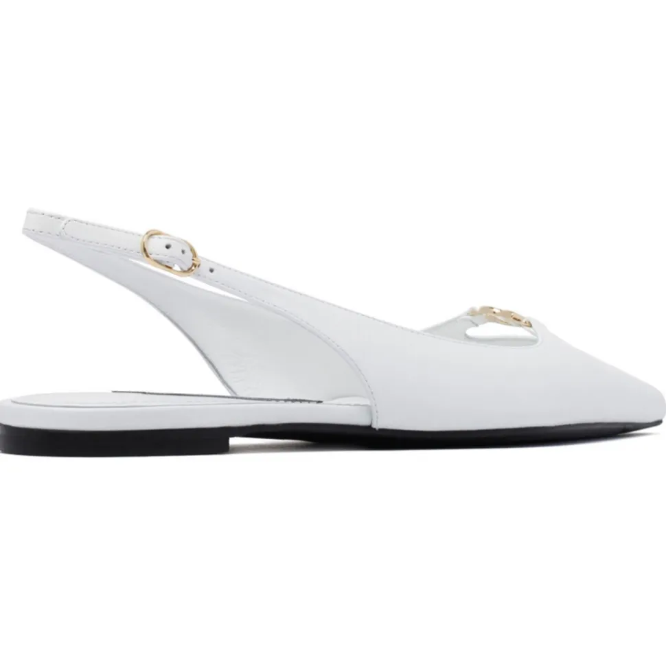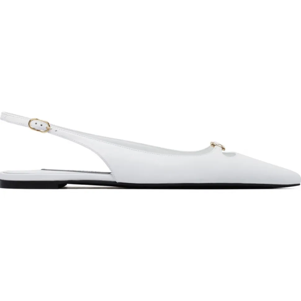 Dolce & Gabbana White Slingback Shoes. White lambskin slingback shoes, buckle fastening slingback strap. Branded insole, logo patch to the front, pointed toe, gold tone hardware.