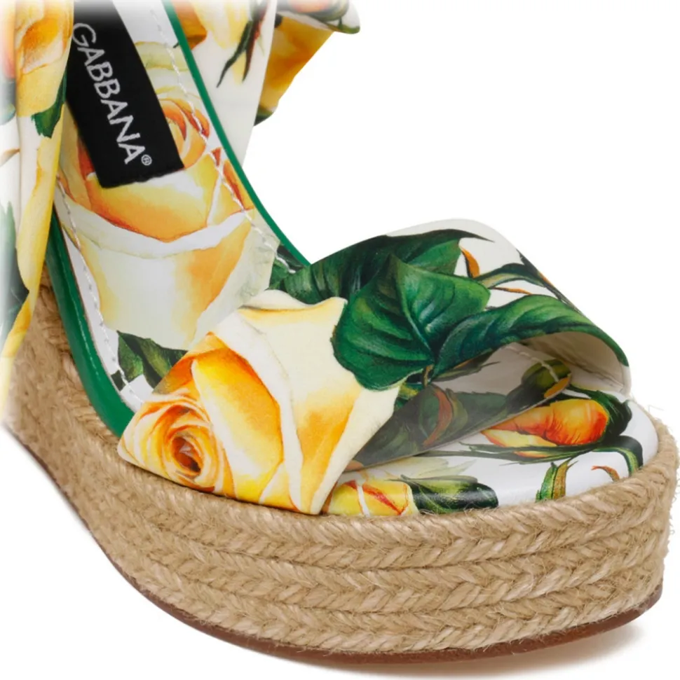 Dolce & Gabbana Yellow Printed Sandals. Yellow rose print charmeuse wedge sandals, 90 mm platform wedge, printed leather insole eighth branded label. Woven rope wedge, branded rubber sole.
