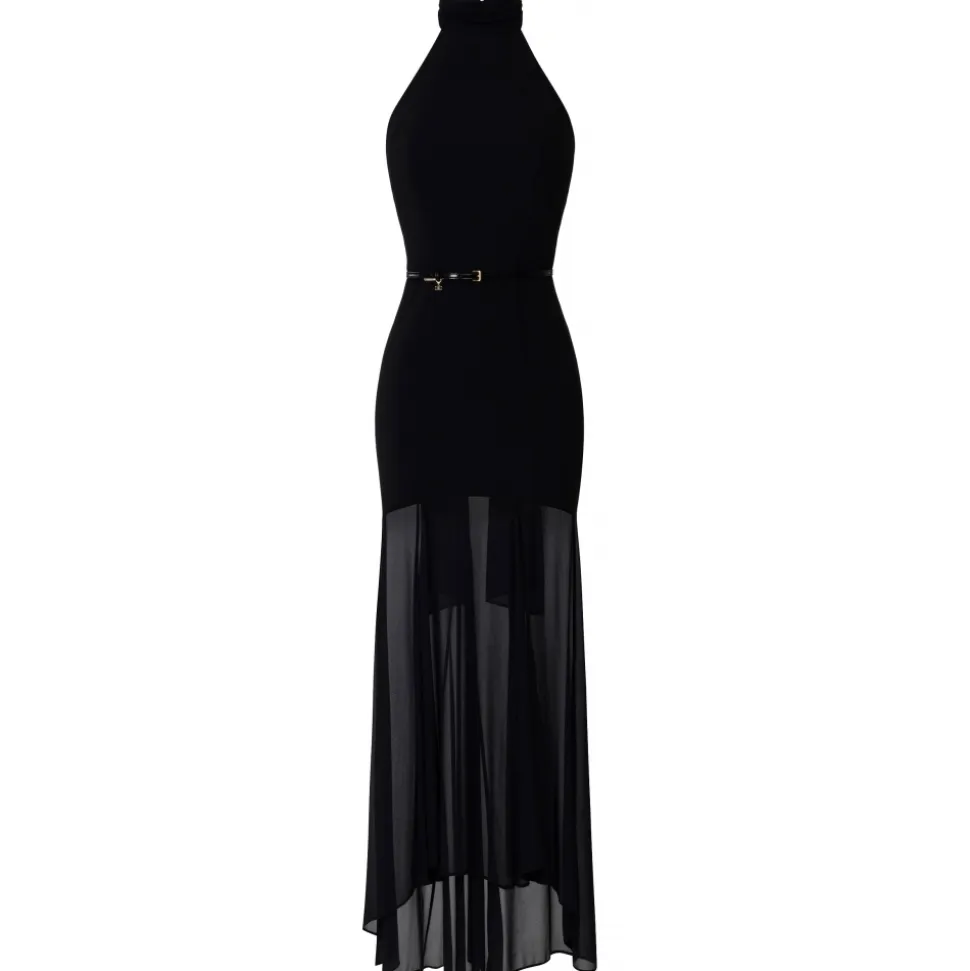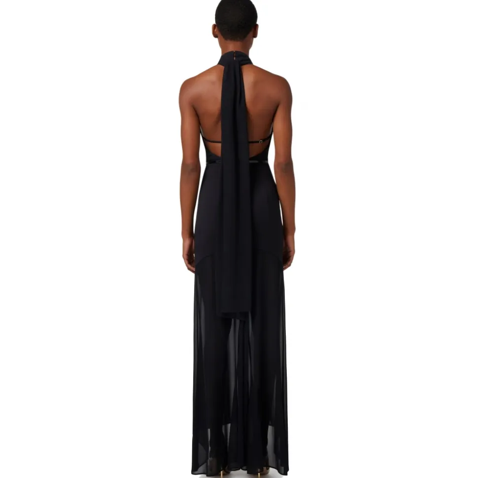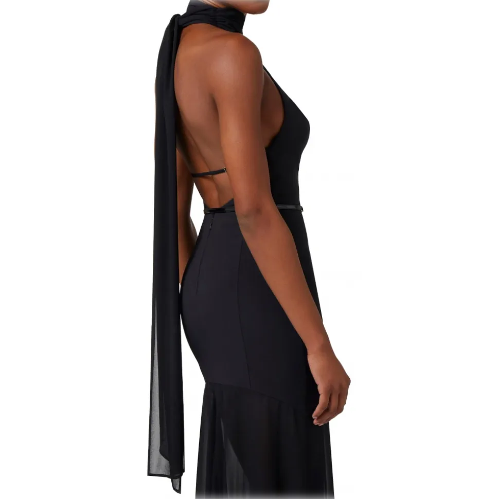 Elisabetta Franchi red carpet dress in lightweight stretch crepe with georgette skirt. American neckline with scarf and deep back neckline. Invisible back zip, removable belt with gold m