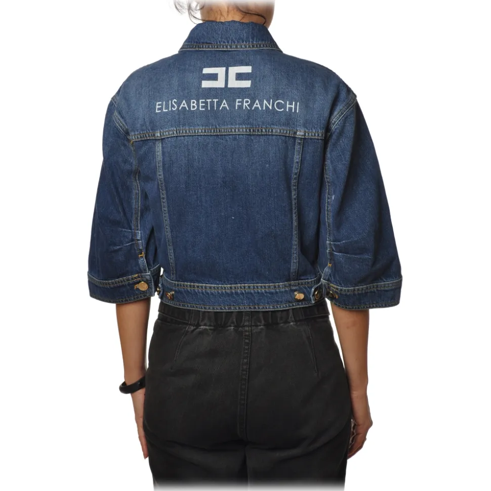 Elisabetta Franchi jacket, short model with wide 3/4 sleeves, with logo writing in contrasting color on the back with buttons, in denim canvas.
