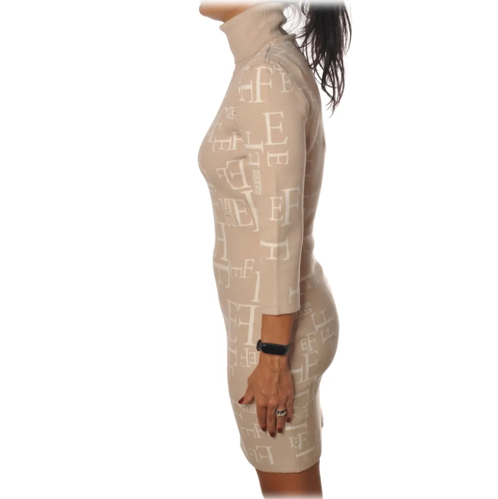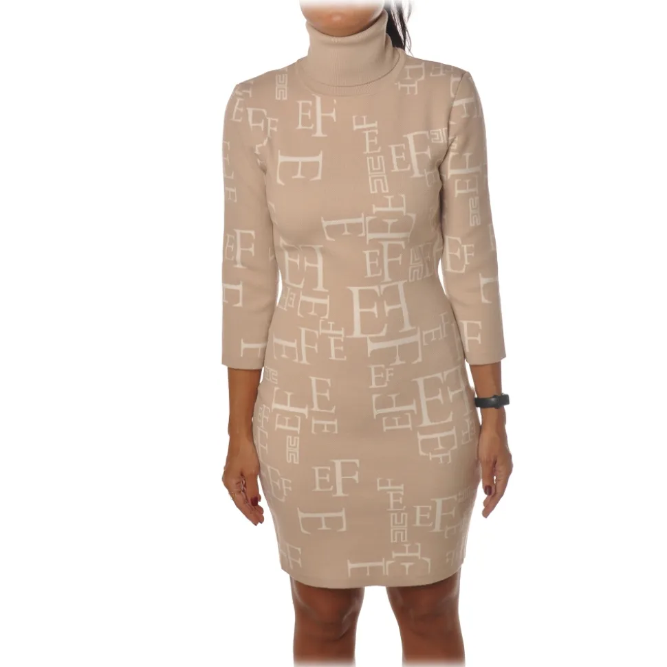Elisabetta Franchi – High-Neck Dress in Logoed Fantasy – Beige/White – Dress – Made in Italy – Luxury Exclusive Collection