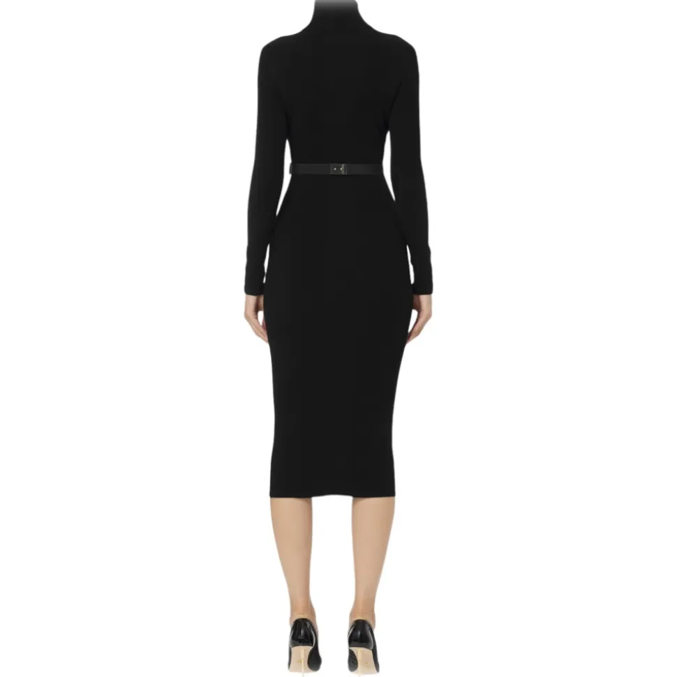 Elisabetta Franchi – High Neck Ribbed Longuette Dress – Black – Dress – Made in Italy – Luxury Exclusive Collection