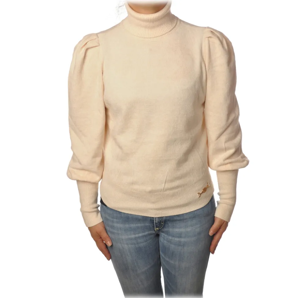 Elisabetta Franchi sweater, high neck model, long sleeves, with puff sleeves and high cuff, in stretch chenille fabric, with metal logo detail on one side.