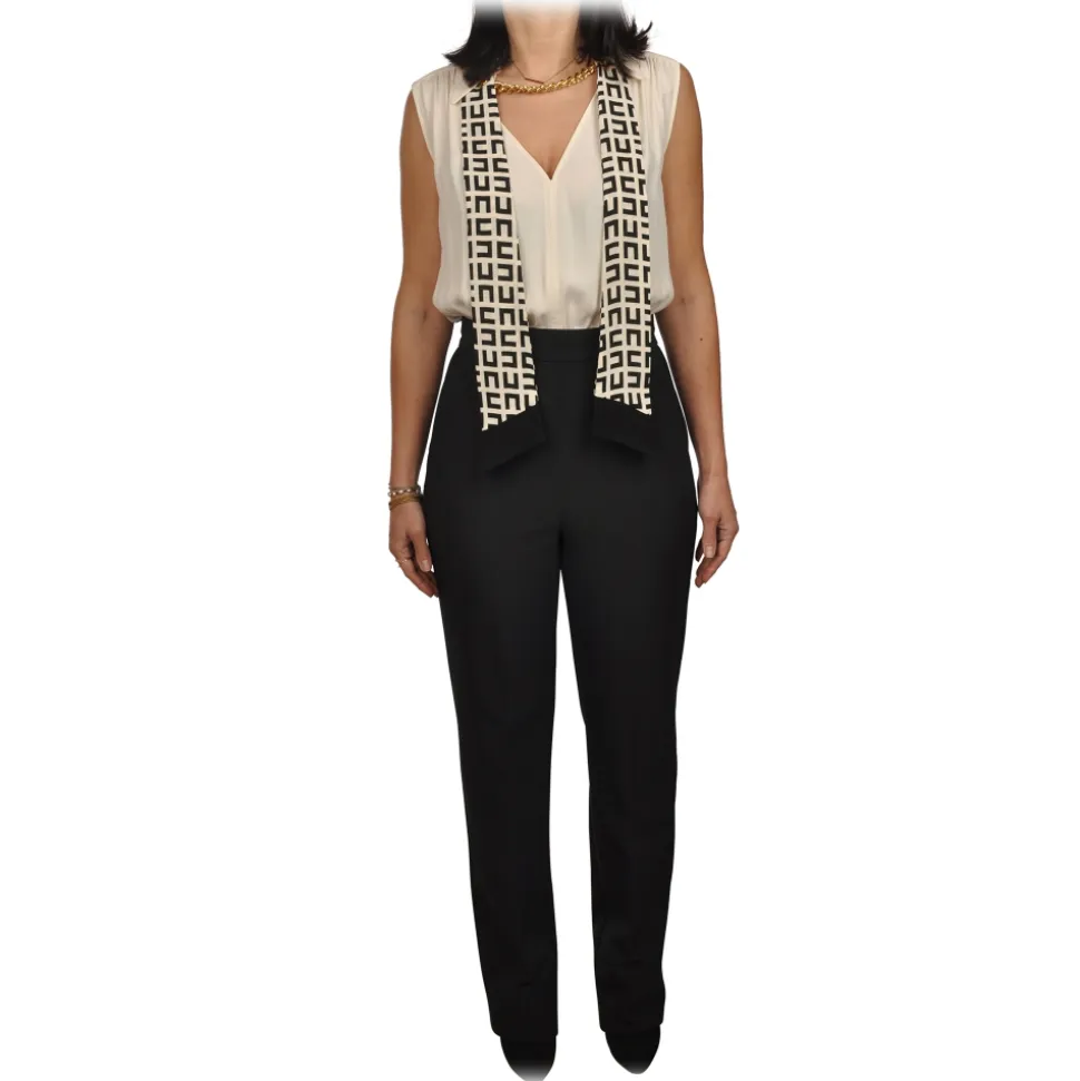 Elisabetta Franchi jumpsuit, sleeveless one-piece model, “V” shirt neckline, with charm and removable logo patterned scarf, high waist pants with straight leg in stretch technical fabric, divisible.