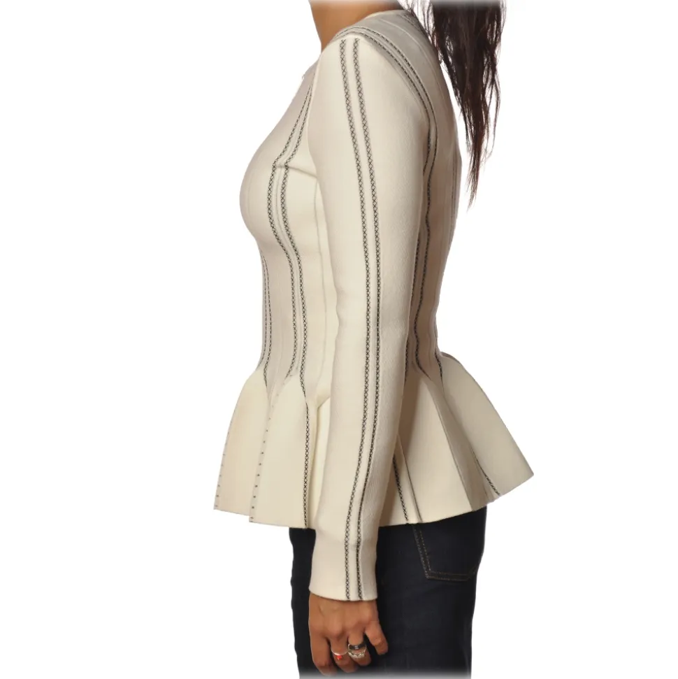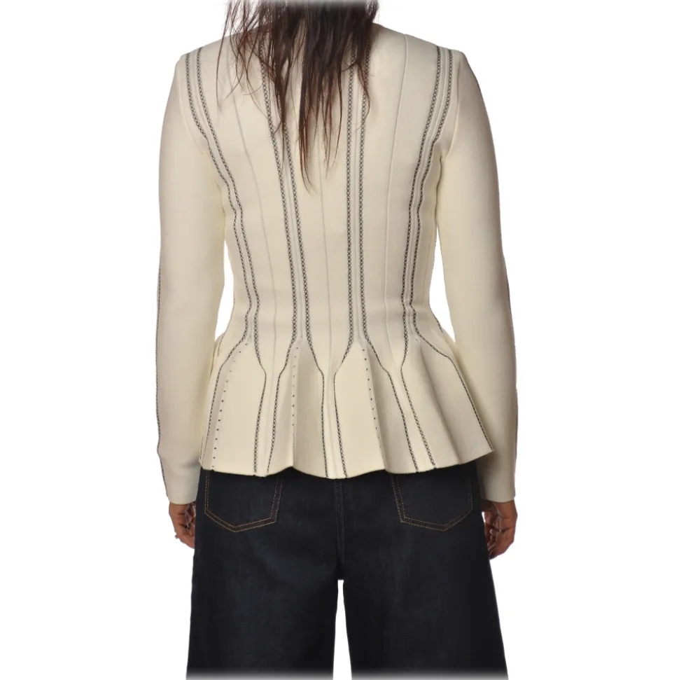 Elisabetta Franchi jacket, long sleeve screwed knit jacket model, crew neck with zip closure on the front, with embroidered flared details on the bottom, in stretch yarn.