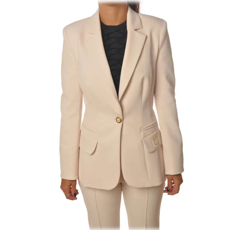 Elisabetta Franchi jacket, model screwed with a jewel button, with deep lapel, with four pockets, two flush, two patch, with open cuff, with logo on one side.