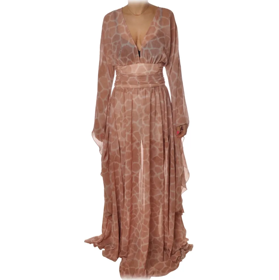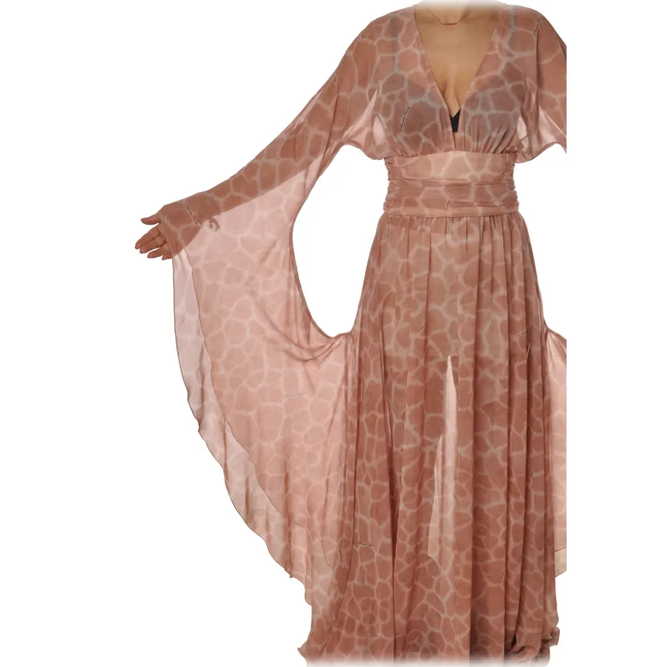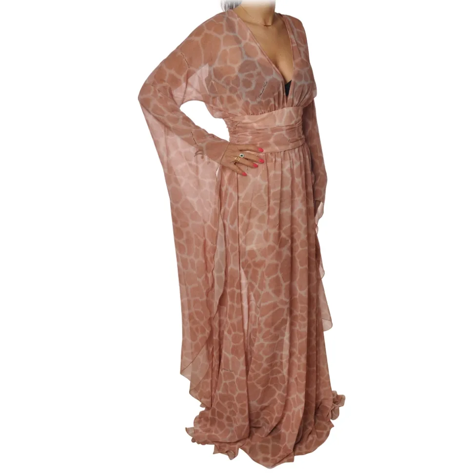 Elisabetta Franchi dress, long model with wide sleeves, with V-neckline, with underbust band, in giraffe print fantasy.